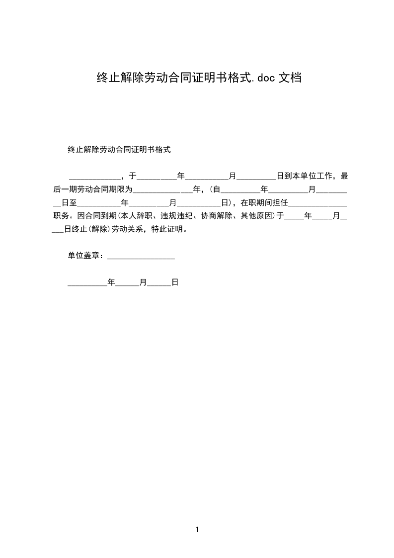 终止解除劳动合同证明书格式