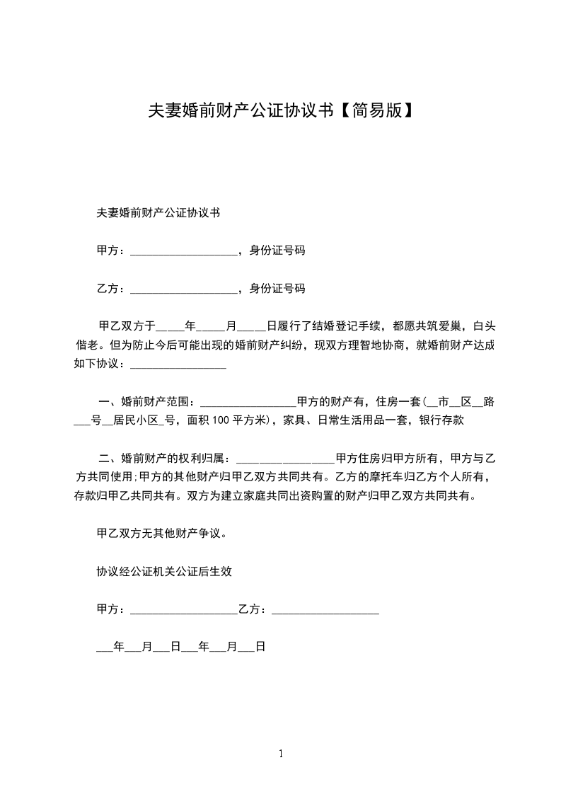一、婚前财产范围:_________________甲方的财产有,住房一套(__市__区__路___号__居民小区_号,面积100平方米),家具、日常生活用品一套,银行存款