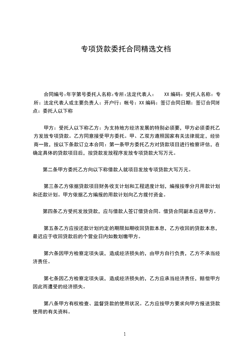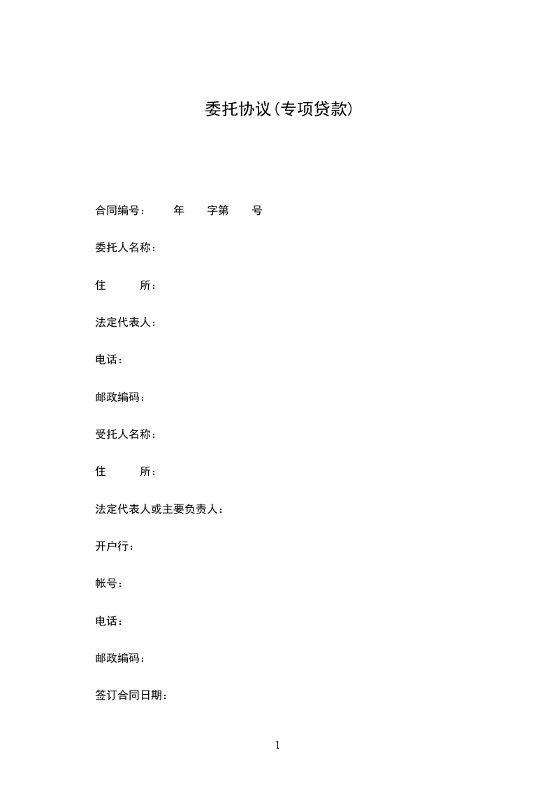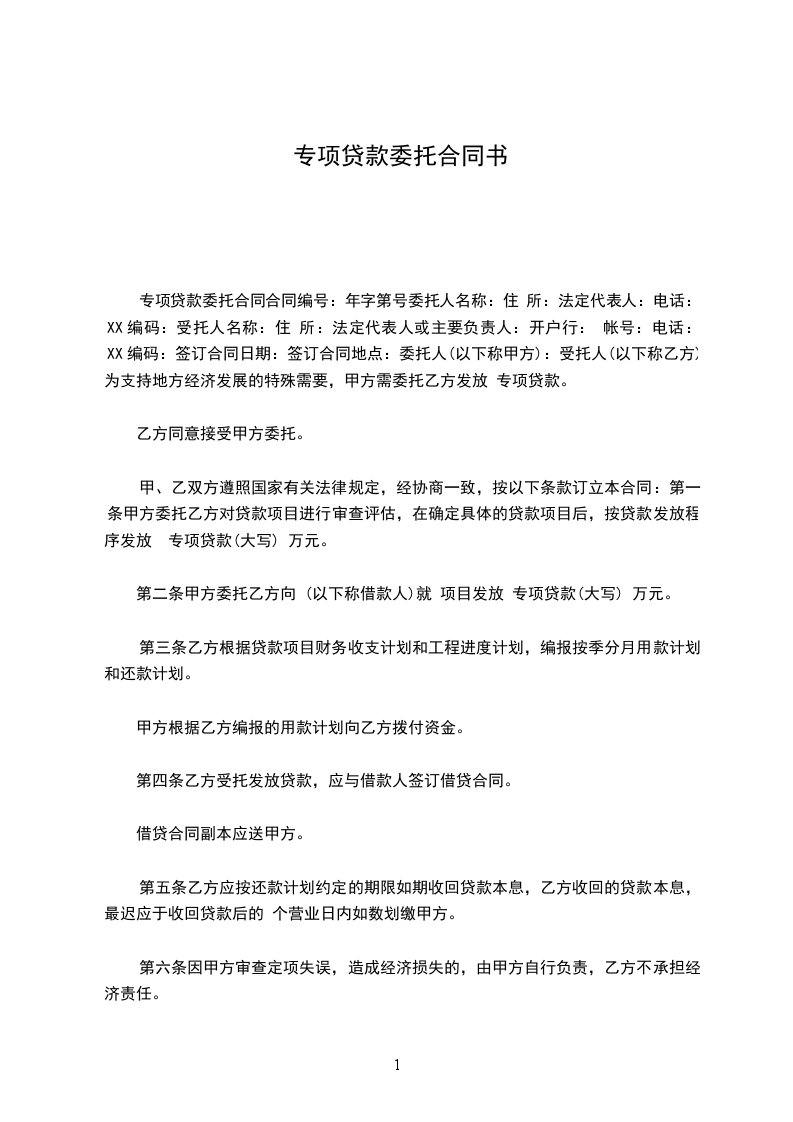 签订合同日期:___________签订合同地点:___________委托人(以下称甲方):___________受托人(以下称乙方):___________为支持地方经济发展的特殊需要,甲方需委托乙方发放 专项贷款。乙方同意接受甲方委托。甲、乙双方遵照国家有关法律规定,经协商一致,按以下条款订立本合同: