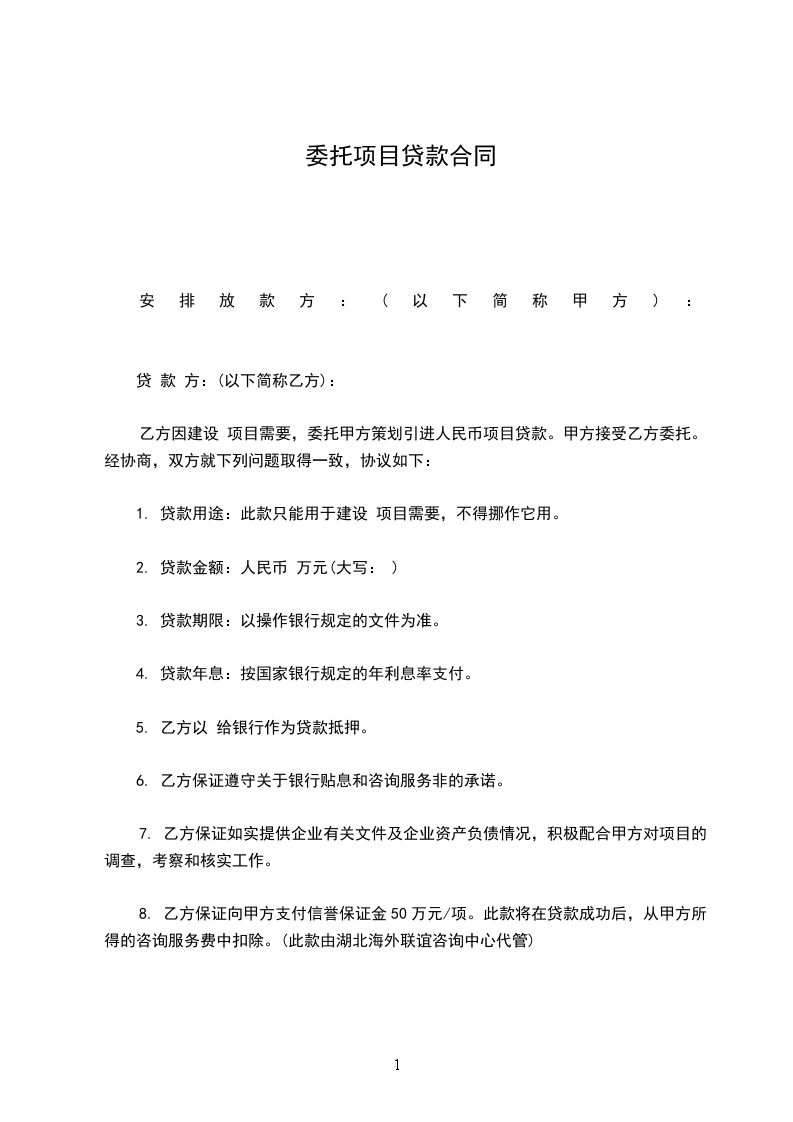 第一条、甲方委托乙方对贷款项目进行审查评估,在确定具体的贷款项目后,按贷款发放程序发放 专项贷款(大写) ____万元。