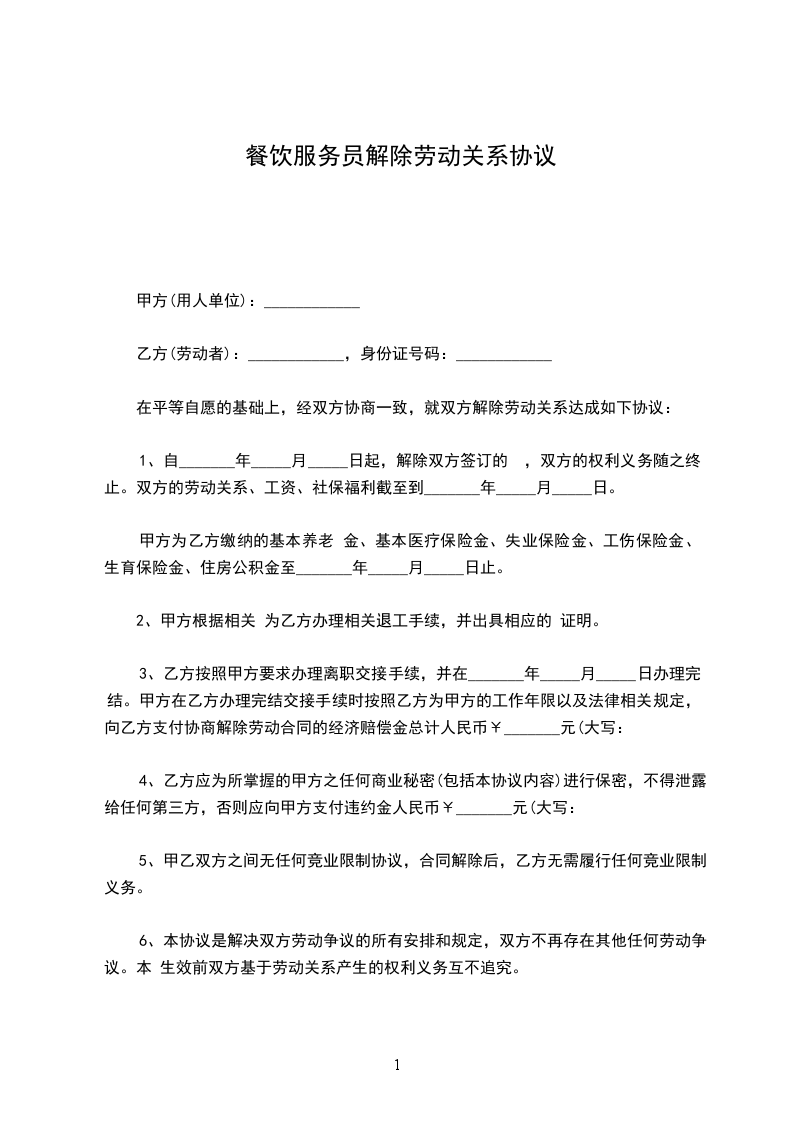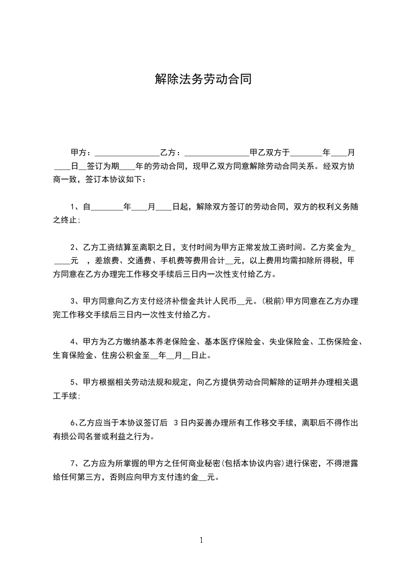 1、双方一致同意于______年______月______日解除劳动合同,双方的劳动权利义务终止;
