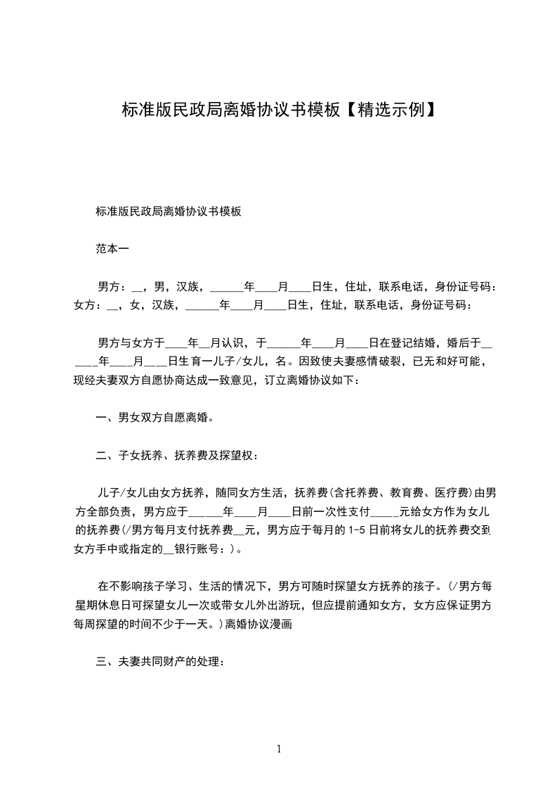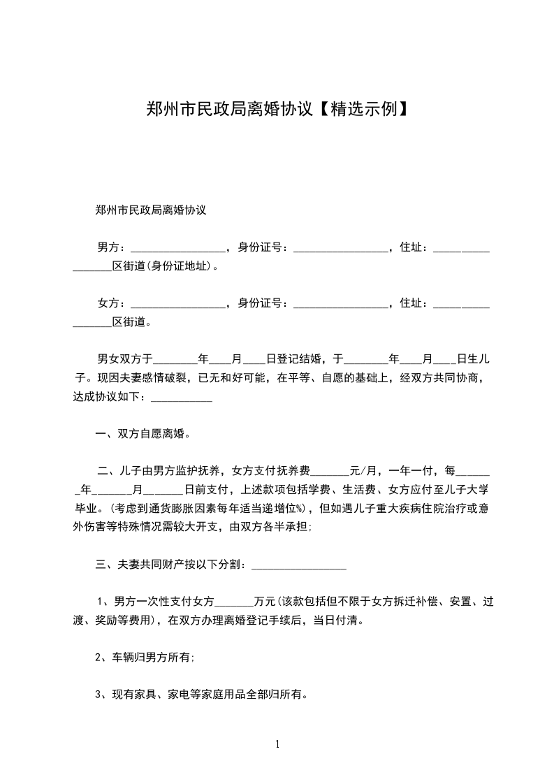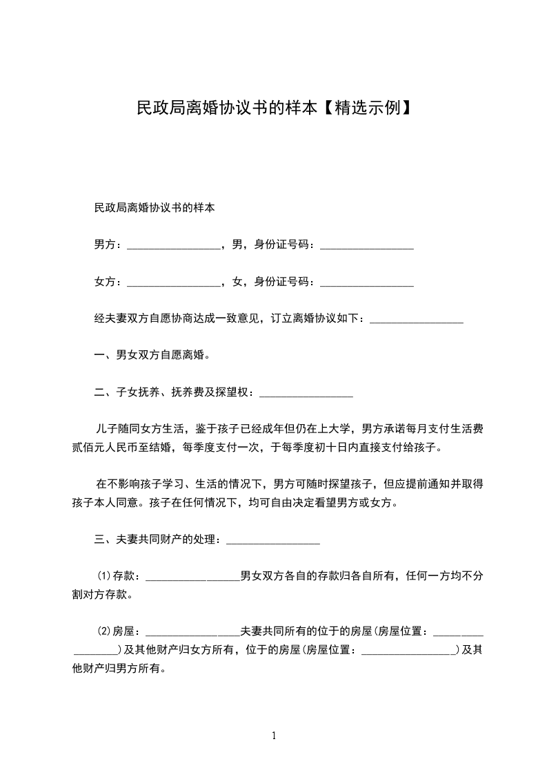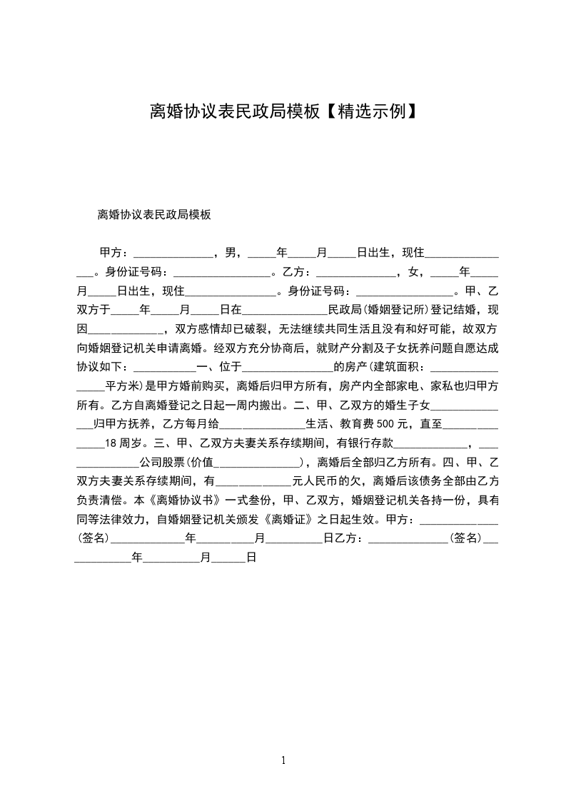 离婚协议表民政局模板