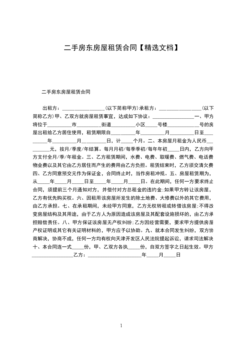 出租方:_________________(以下简称甲方)承租方:_________________(以下简称乙方)甲、乙双方就房屋租赁事宜,达成如下协议:_________________一、甲方将位于__________市__________街道__________小区_____号楼_____________号的房屋出租给乙方居住使用,租赁期限自__________年__________月__________日至__________年__________月__________日,计_____个月。二、本房屋月租金为人民币__________元,按月/季度/年结算。每月月初/每季季初/每年年初_____日内,乙方向甲方支付全月/季/年租金。三、乙方租赁期间,水费、电费、取暖费、燃气费、电话费、物业费以及其它由乙方居住而产生的费用由乙方负担。租赁结束时,乙方须交清欠费。四、乙方同意预交元作为保证金,合同终止时,当作房租冲抵。五、房屋租赁期为,从_____年_____月_____日至_____年_____月_____日。在此期间,任何一方要求终止合同,须提前三个月通知对方,并偿付对方总租金的违约金;如果甲方转让该房屋,乙方有优先购买权。六、因租用该房屋所发生的除土地费、大修费以外的其它费用,由乙方承担。七、在承租期间,未经甲方同意,乙方无权转租或转借该房屋;不得改变房屋结构及其用途,由于乙方人为原因造成该房屋及其配套设施损坏的,由乙方承担赔偿责任。八、甲方保证该房屋无产权纠纷;乙方因经营需要,要求甲方提供房屋产权证明或其它有关证明材料的,甲方应予以协助。九、就本合同发生纠纷,双方协商解决,协商不成,任何一方均有权向天津开发区人民法院提起诉讼,请求司法解决。十、本合同连一式_____份,甲、乙双方各执_____份,自双方签字之日起生效。甲方:_________________乙方:______________________年_____月_____日