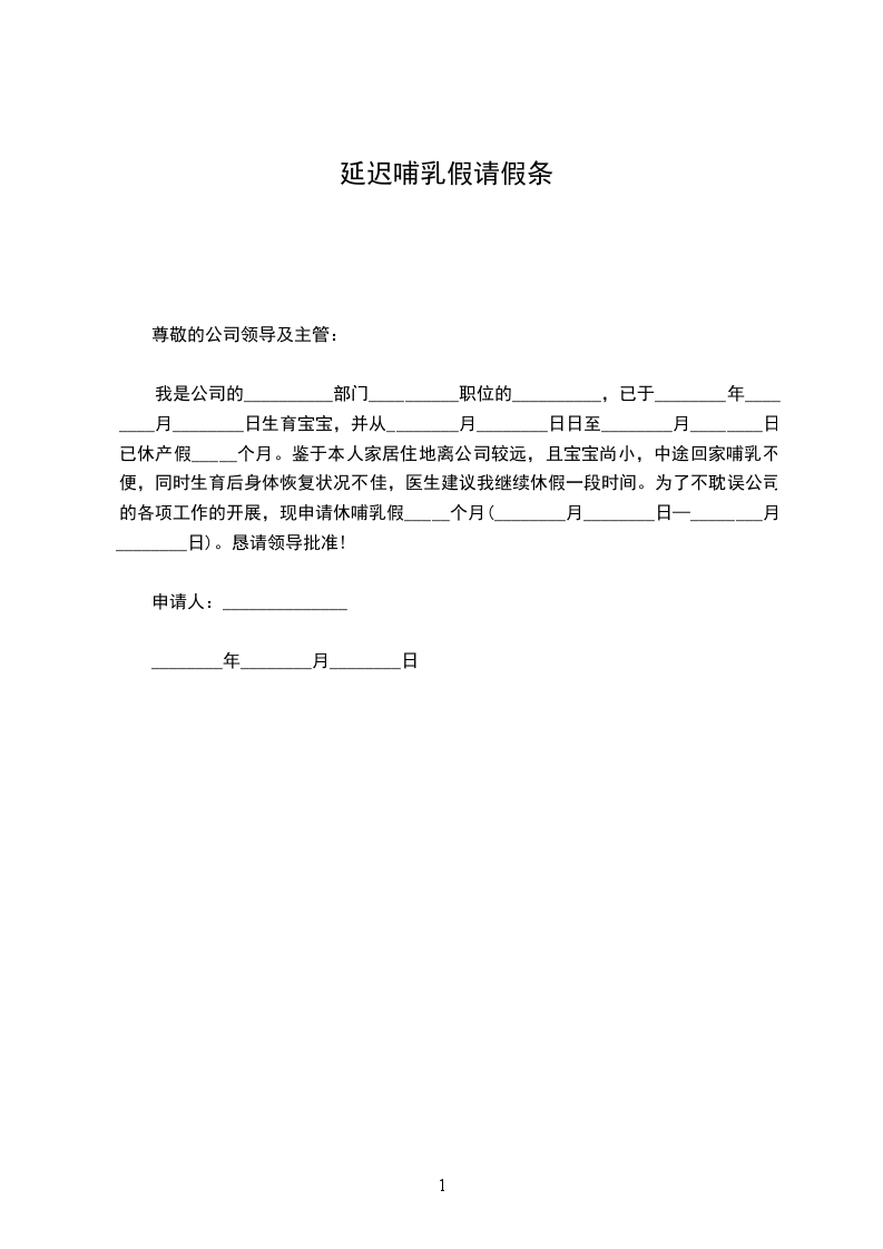 我是公司的__________部门__________职位的__________,已于________年________月________日生育宝宝,并从________月________日日至________月________日已休产假_____个月。鉴于本人家居住地离公司较远,且宝宝尚小,中途回家哺乳不便,同时生育后身体恢复状况不佳,医生建议我继续休假一段时间。为了不耽误公司的各项工作的开展,现申请休哺乳假_____个月(________月________日—________月________日)。恳请领导批准!
