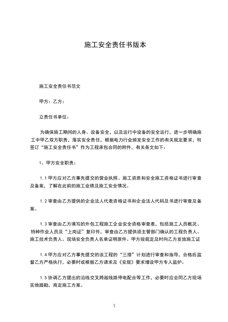 为确保施工期间的人身、设备安全,以及运行中设备的安全运行,进一步明确施工中甲乙双方职责,落实安全责任,根据电力行业颁发安全工作的有关规定要求,特签订“施工安全责任书”作为工程承包合同的附件,有关条文如下: