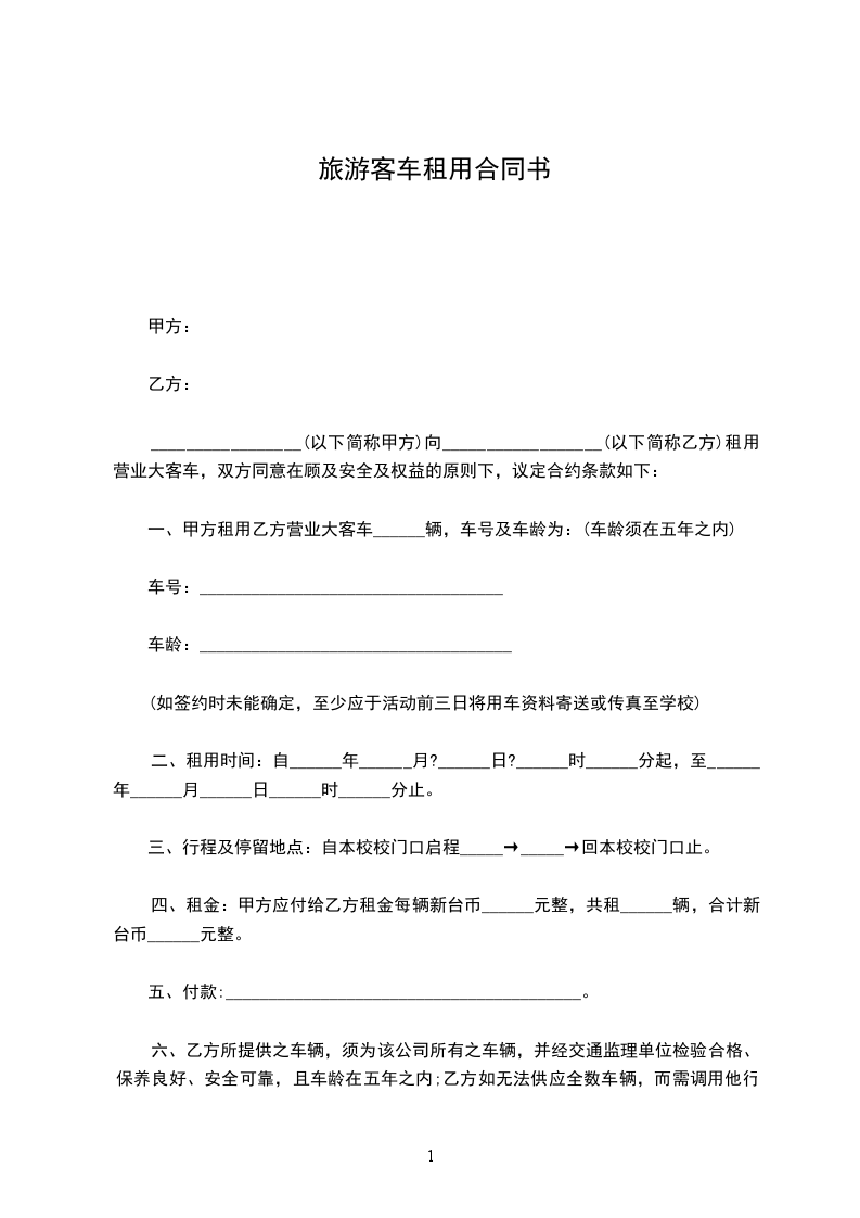 _________________(以下简称甲方)向__________________(以下简称乙方)租用营业大客车,双方同意在顾及安全及权益的原则下,议定合约条款如下: