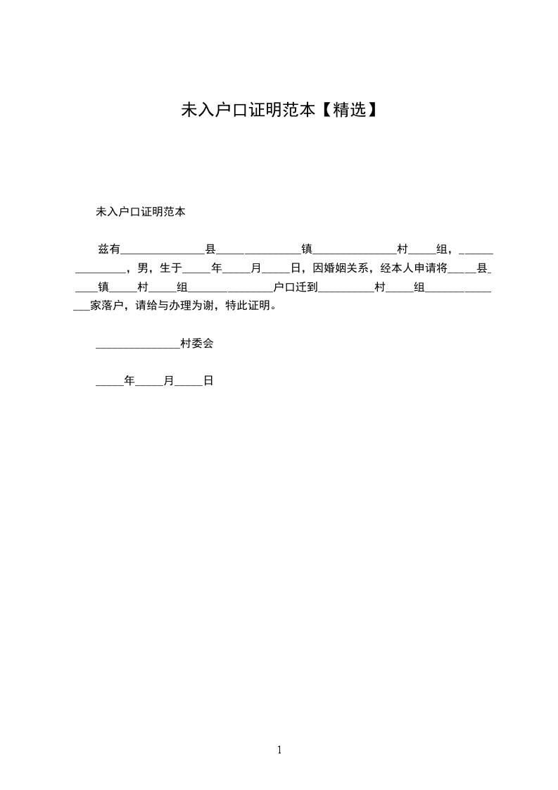 兹有_______________县_______________镇_______________村_____组,_______________,男,生于_____年_____月_____日,因婚姻关系,经本人申请将_____县_____镇_____村_____组_______________户口迁到__________村_____组_______________家落户,请给与办理为谢,特此证明。