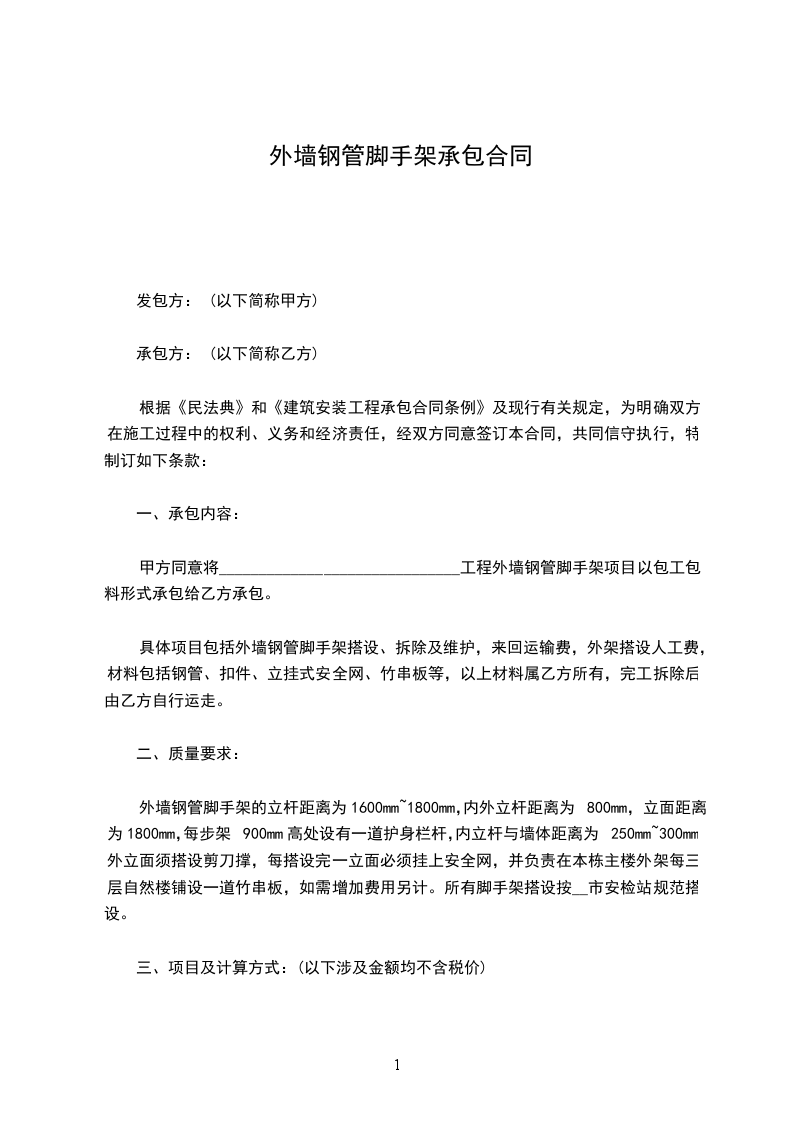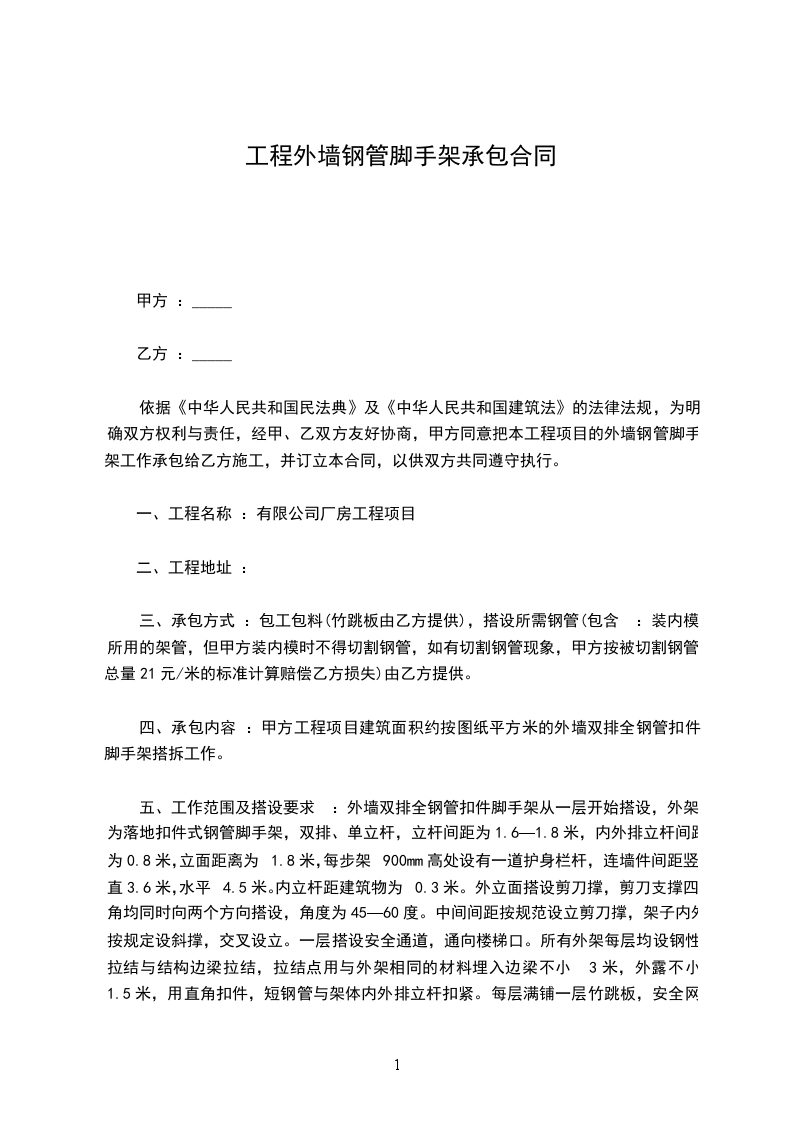 项目钢管脚手架分项工程发包给乙方施工,根据《中华人民共和国民法典》、《中华人民共和国建筑法》和《建筑安装工程承包合同条例》及其他有关法律、行政法规的规定,结合本工程实际情况,为明确双方的权利、义务和责任,特定立如下合同条款,作为双方共同遵守的依据。