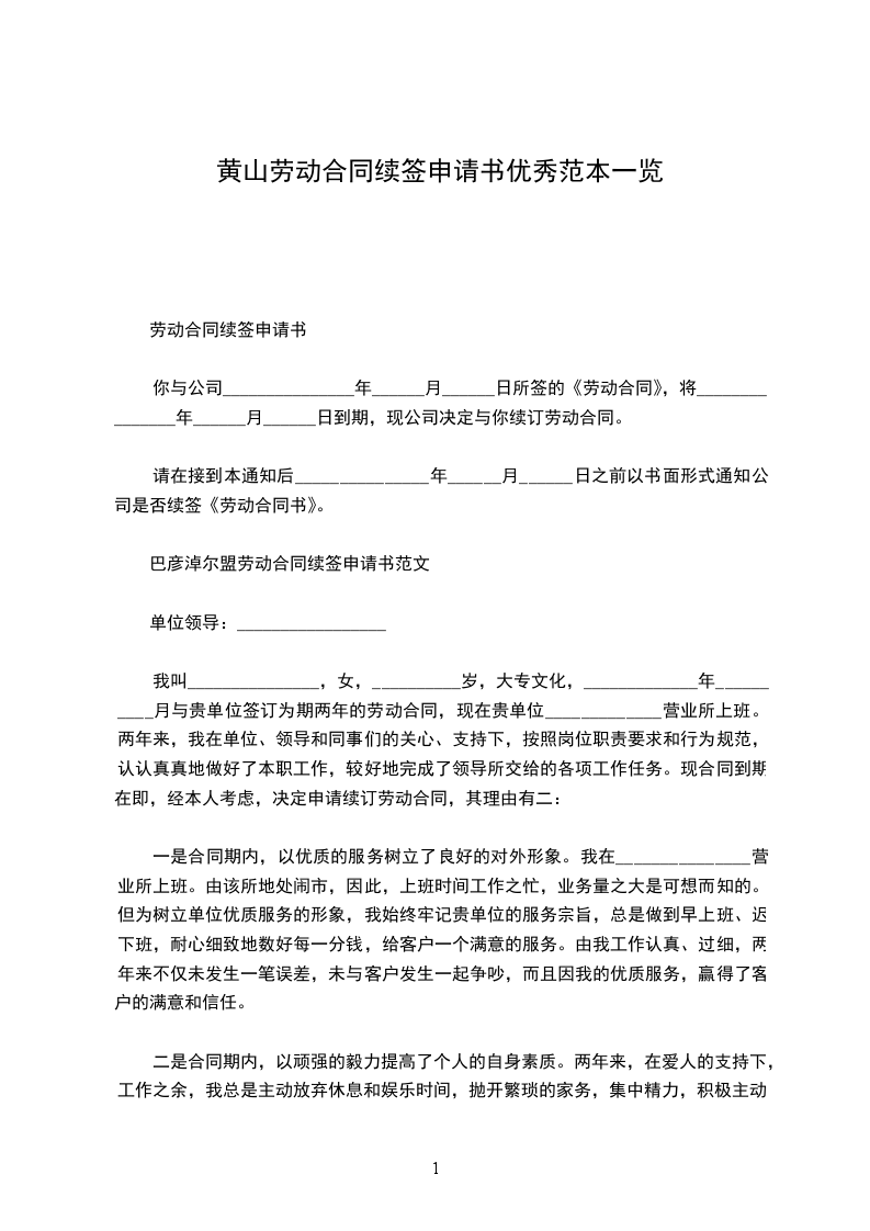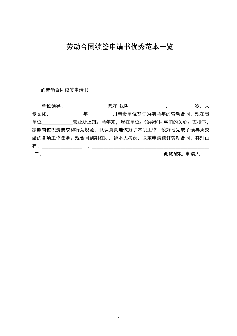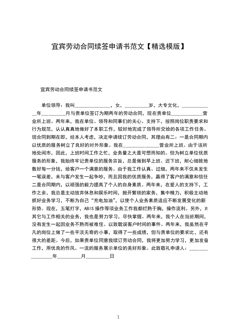单位领导:我叫_______________,女,__________岁,大专文化,_____________年__________月与贵单位签订为期两年的劳动合同,现在贵单位_____________营业所上班。两年来,我在单位、领导和同事们的关心、支持下,按照岗位职责要求和行为规范,认认真真地做好了本职工作,较好地完成了领导所交给的各项工作任务。现合同到期在即,经本人考虑,决定申请续订劳动合同,其理由有二:一是合同期内,以优质的服务树立了良好的对外形象。我在_______________营业所上班。由于该所地处闹市,因此,上班时间工作之忙,业务量之大是可想而知的。但为树立单位优质服务的形象,我始终牢记贵单位的服务宗旨,总是做到早上班、迟下班,耐心细致地数好每一分钱,给客户一个满意的服务。由于我工作认真、过细,两年来不仅未发生一笔误差,未与客户发生一起争吵,而且因我的优质服务,赢得了客户的满意和信任。二是合同期内,以顽强的毅力提高了个人的自身素质。两年来,在爱人的支持下,工作之余,我总是主动放弃休息和娱乐时间,抛开繁琐的家务,集中精力,积极主动地抓好业务学习,不断为自己“充电加油”,以使个人业务素质适应不断发展变化的新形势。现在,五笔打字,ABIS操作等项业务工作我都烂熟于胸,操作流利。另外,对其它与工作相关的业务,我也是努力学习,尽快掌握。两年来,我个人在当班期间,没有发生一起因业务不熟而被难住、以致耽误客户时间的事件。两年来,我虽然在平凡的岗位上做了一些平淡无奇的小事,取得了一些成绩,但与贵单位的要求比,还有很大的差距。今后,如果贵单位同意我续订劳动合同,我将更加努力学习,更加发奋工作,用优良的作风、一流的服务展示单位的美好形象。此致敬礼申请人:_________________年__________月__________日