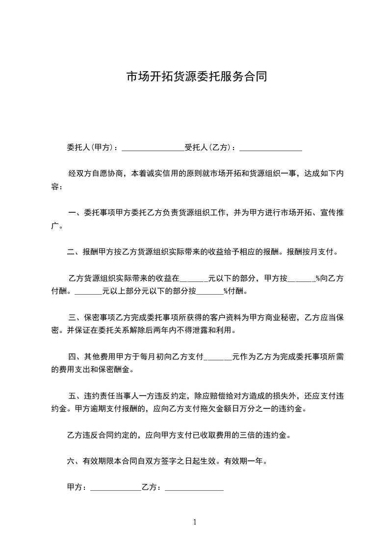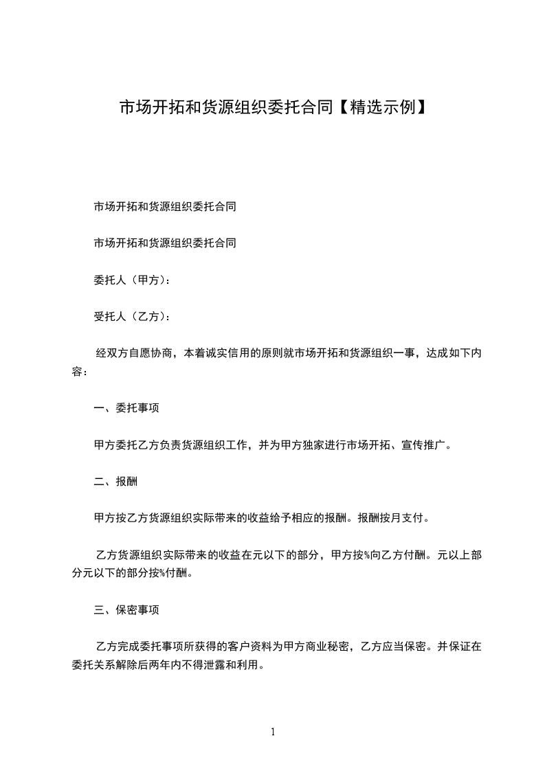 一、委托事项甲方委托乙方负责货源组织工作,并为甲方进行市场开拓、宣传推广。