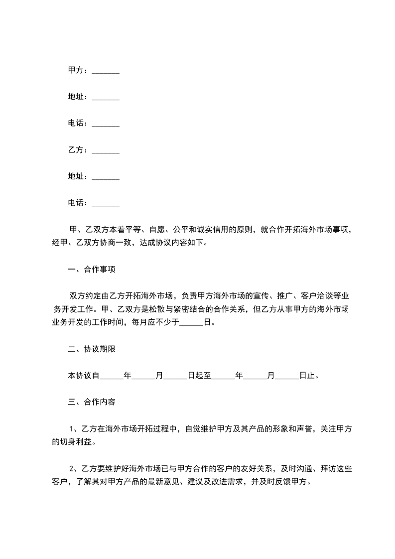 经双方自愿协商,本着诚实信用的原则就市场开拓和货源组织一事,达成如下内容: