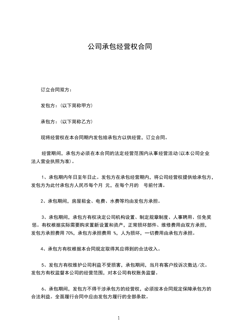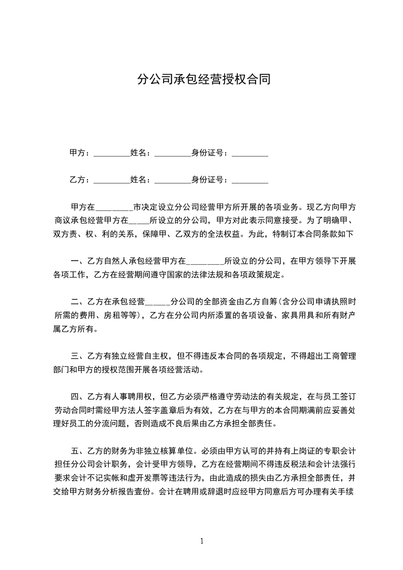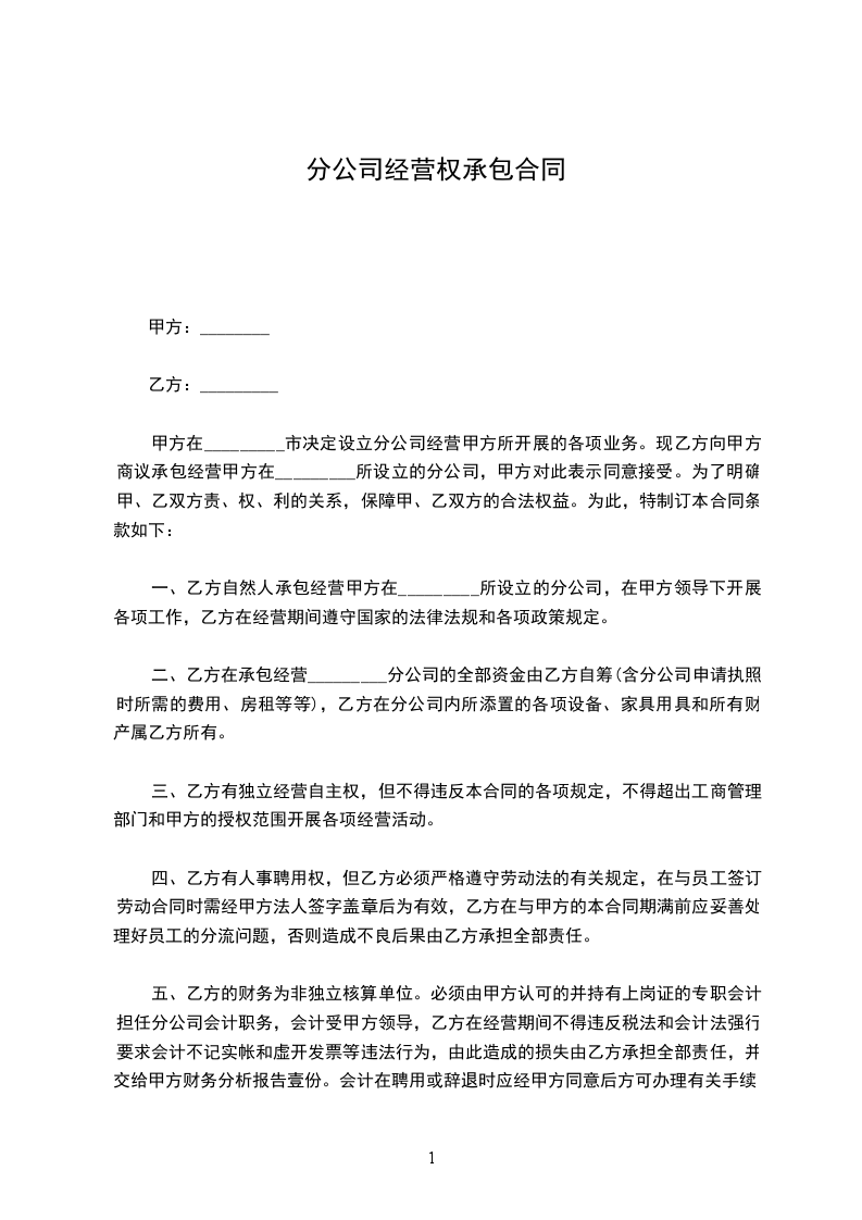 一、乙方自然人承包经营甲方在_________所设立的分公司,在甲方领导下开展各项工作,乙方在经营期间遵守国家的法律法规和各项政策规定。