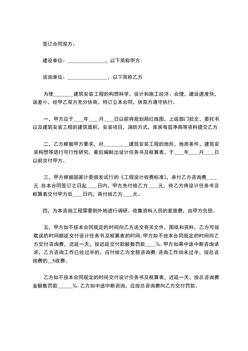 二,乙方根据甲方要求,对__________建筑安装工程的地形,地质条件,建筑安装构想等进行可行性研究,最后编制出设计任务书及框算表,于____年____月____日以前交付甲方。