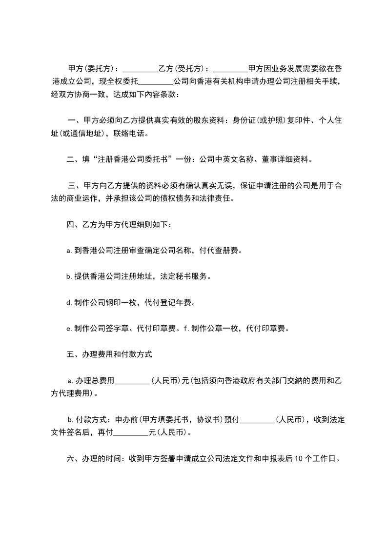 甲方(委托方):_________乙方(受托方):_________甲方因业务发展需要欲在香港成立公司,现全权委托_________公司向香港有关机构申请办理公司注册相关手续,经双方协商一致,达成如下內容条款:
