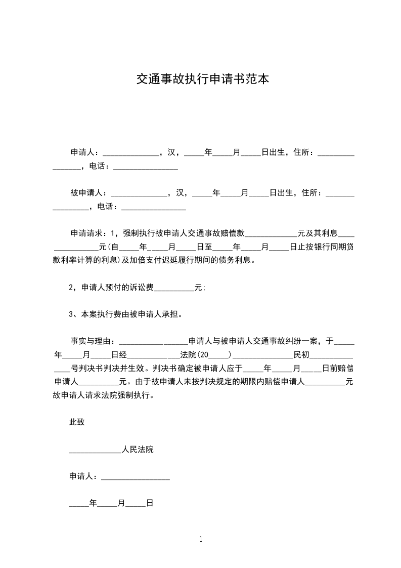 申请请求:_________________,强制执行被申请人交通事故赔偿款_____________元及其利息_______________元(自_____年_____月_____日至_____年_____月_____日止按银行同期贷款利率计算的利息)及加