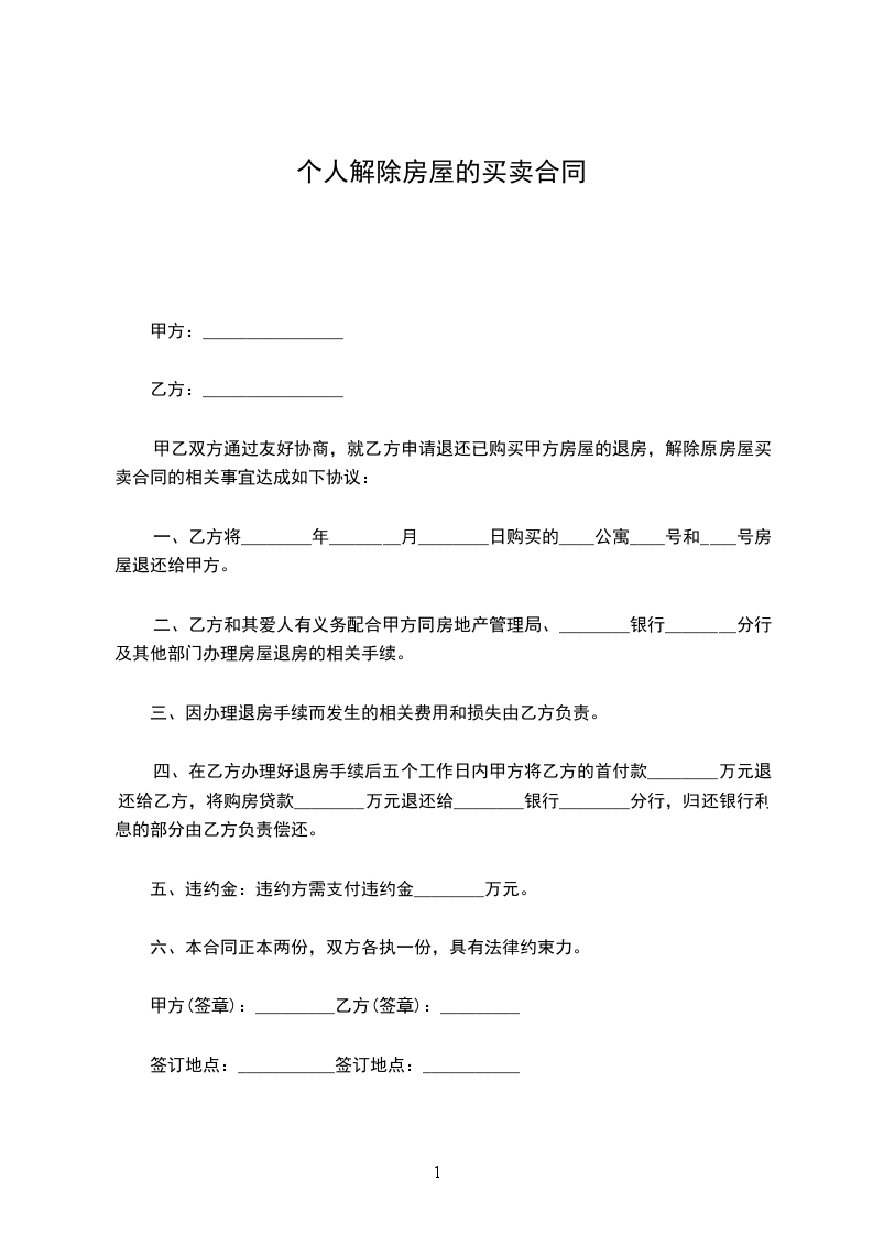 一、乙方将________年________月________日购买的____公寓____号和____号房屋退还给甲方。