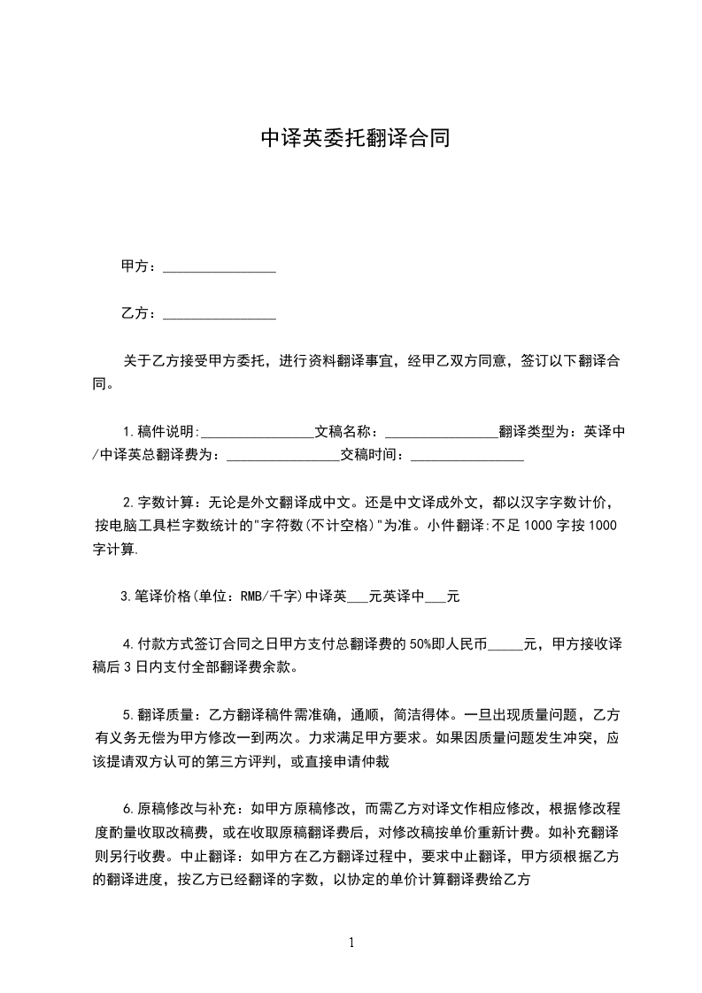 关于乙方接受甲方委托,进行资料翻译事宜,经甲乙双方同意,签订以下翻译合同。