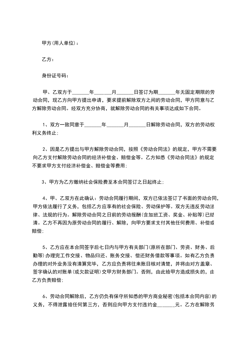 (1)乙方在解除劳动合同时,如果之前签订了保密协议、竞业禁止协议,则仍应对原协议予以遵守;