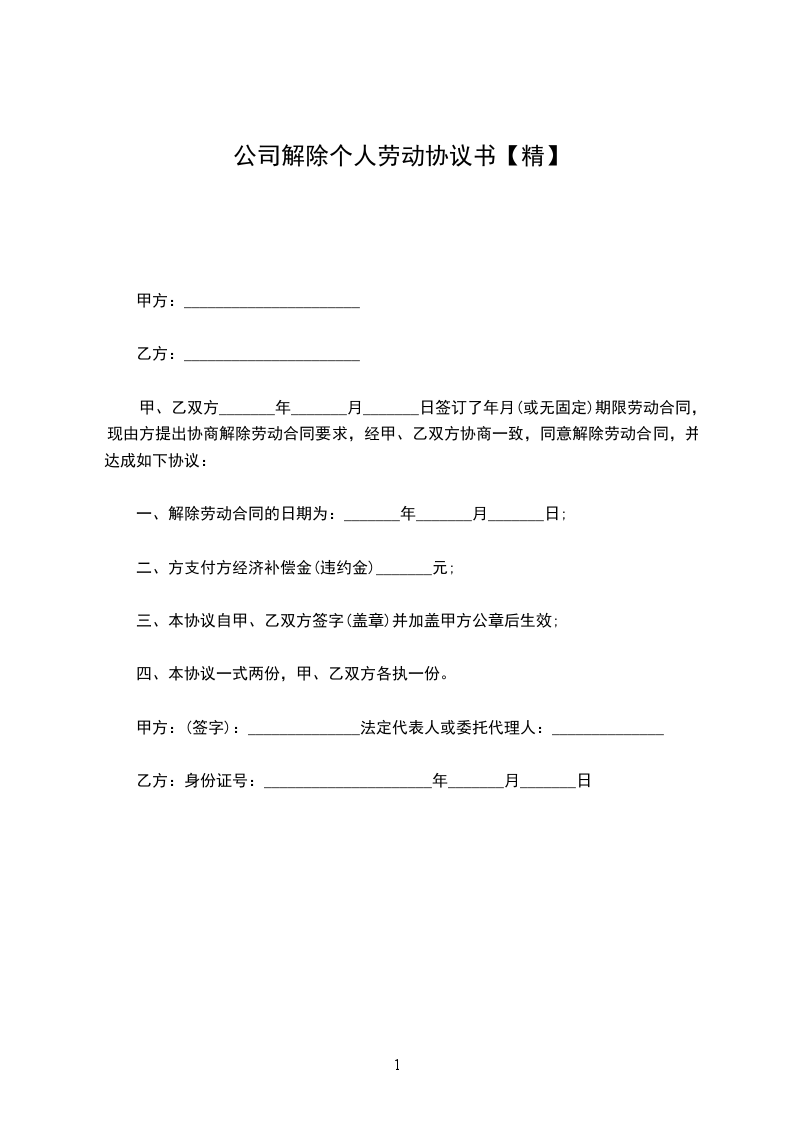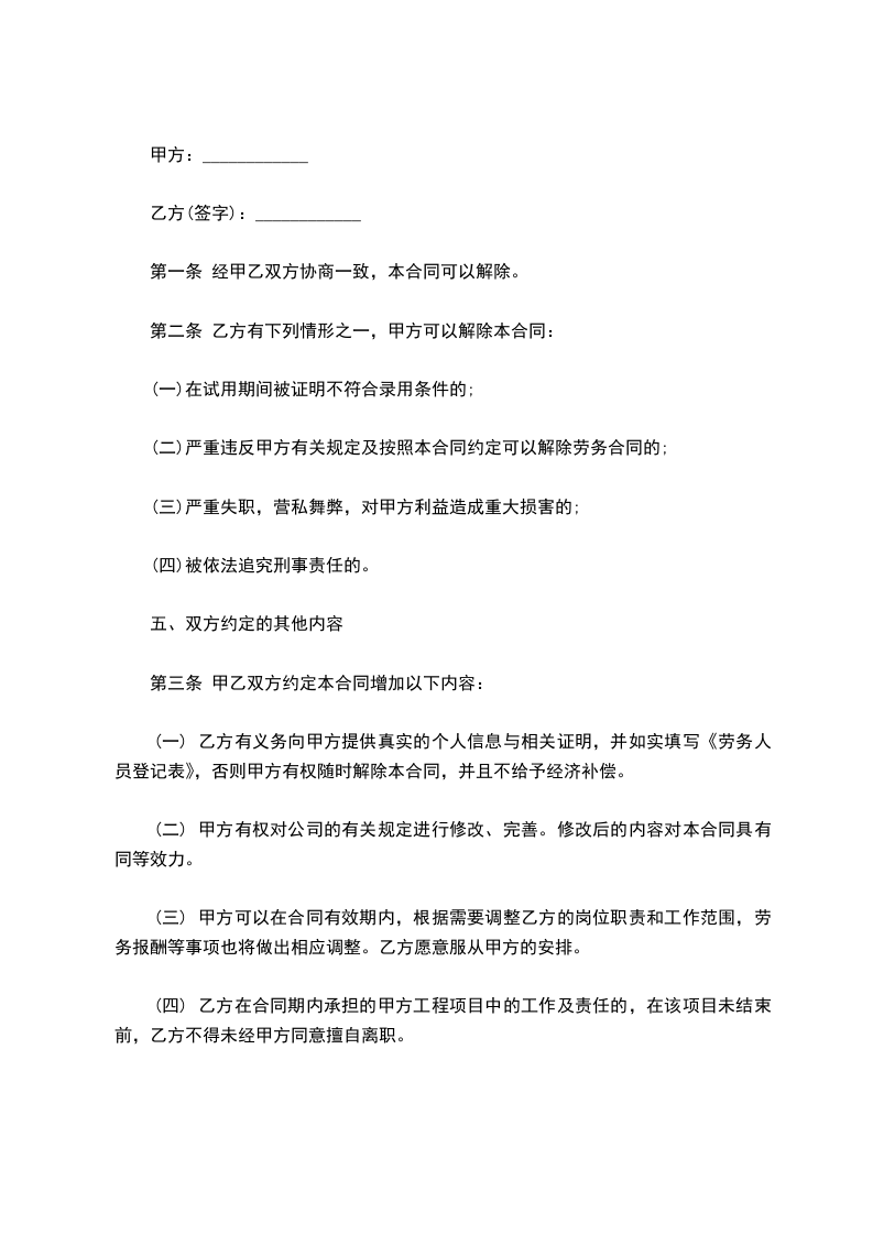 从签订本协议起,甲乙双方原劳动合同即行解除。本协议一式两份,双方各持一份。