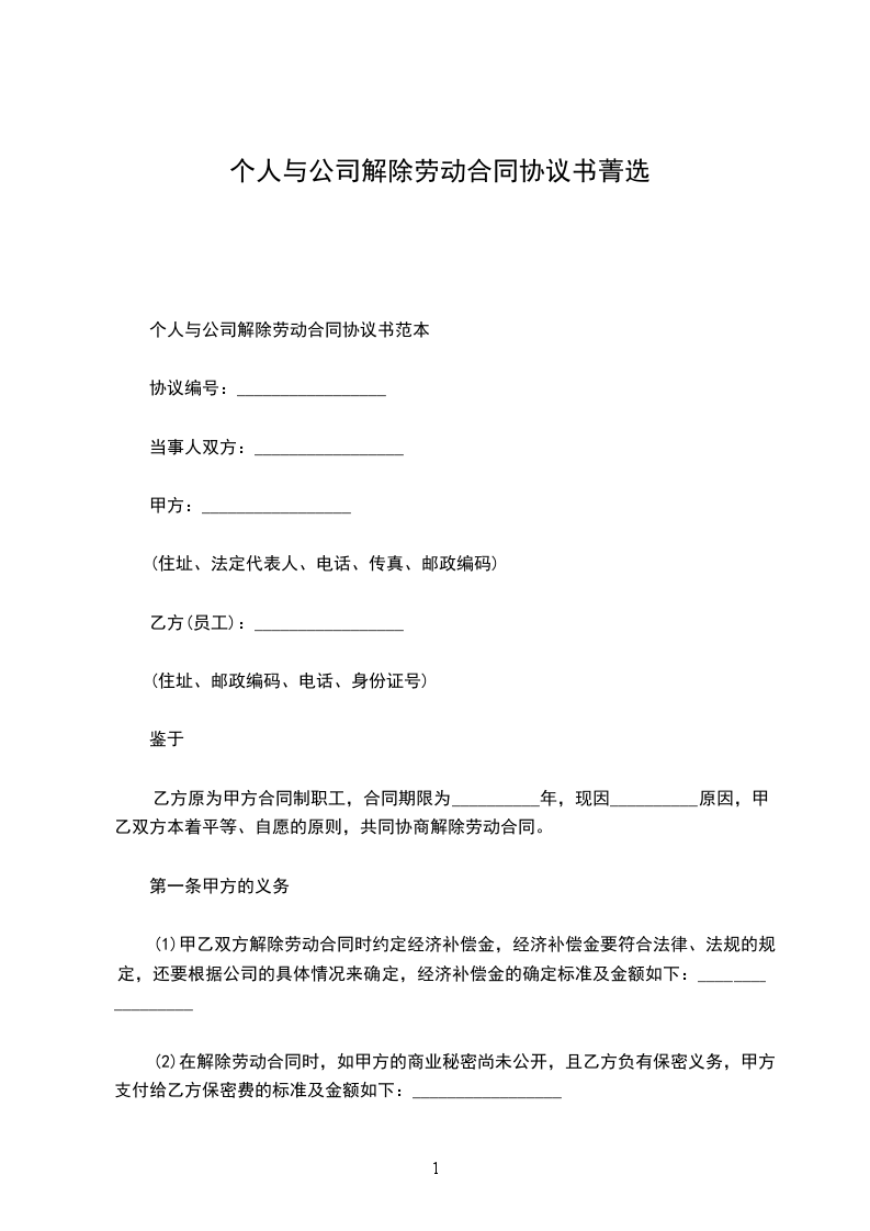 个人与公司解除劳动合同协议书范本