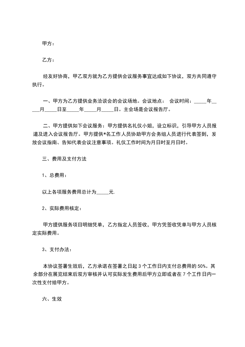 经友好协商,甲乙双方就为乙方提供会议服务事宜达成如下协议,双方共同遵守执行。