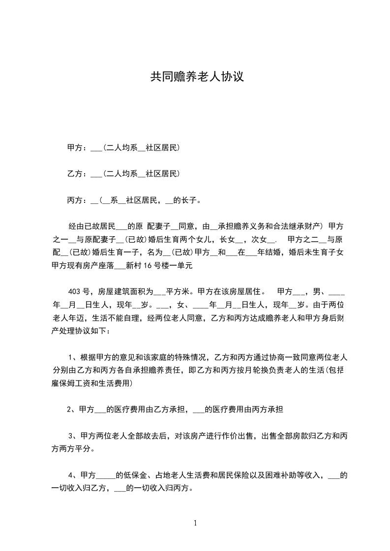 403号,房屋建筑面积为___平方米。甲方在该房屋居住。 甲方___,男、____年__月__日生人,现年__岁。___,女、____年__月__日生人,现年__岁。由于两位老人年迈,生活不能自理,经两位老人同意,乙方和丙方达成赡养老人和甲方身后财产处理协议如下: