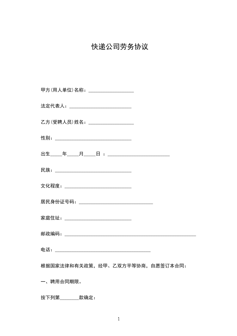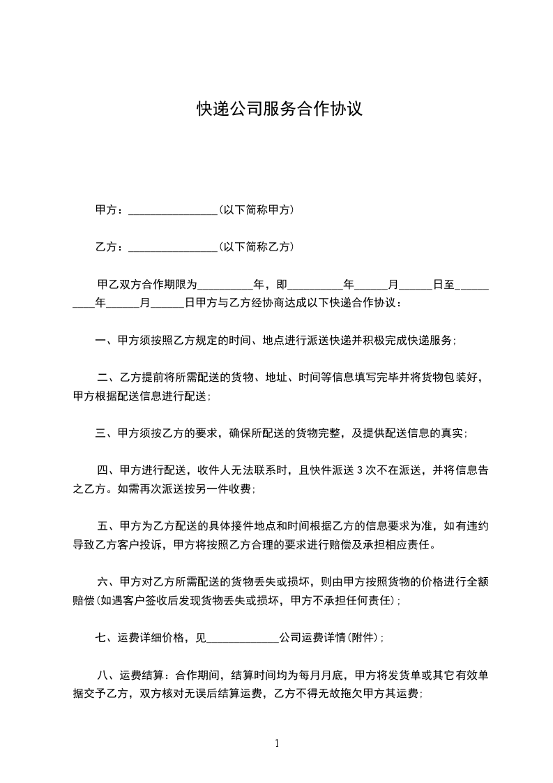 甲乙双方合作期限为__________年,即__________年______月______日至__________年______月______日甲方与乙方经协商达成以下快递合作协议: