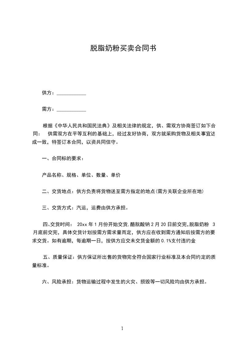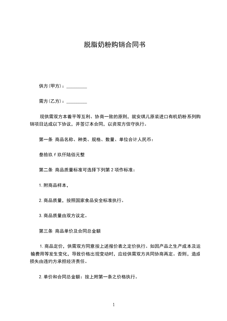 一、合同标的要求:产品名称、规格、单位、数量、单价名称:脱脂奶粉品牌__________单位______________吨数量________单价_________(人民币)人民币小写:________元(大写________________元整)