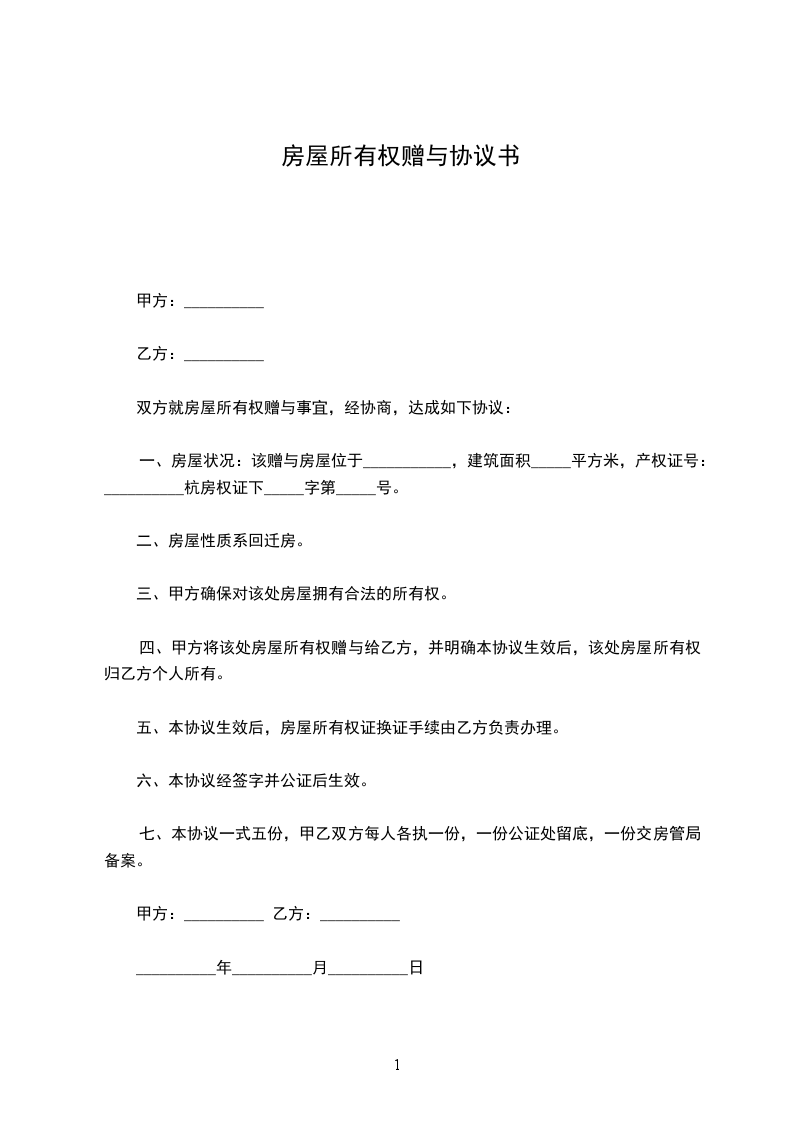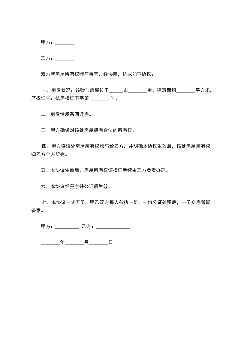 双方就房屋所有权赠与事宜,经协商,达成如下协议: