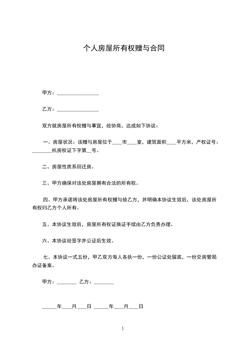 四、甲方承诺将该处房屋所有权赠与给乙方,并明确本协议生效后,该处房屋所有权归乙方个人所有。