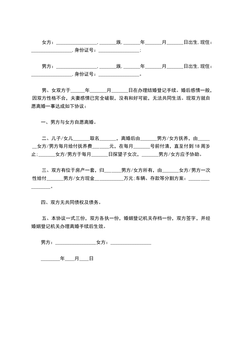 男、女双方于______年_______月_______日在办理结婚登记手续。婚后感情一般,因双方性格不合,夫妻感情已完全破裂,没有和好可能,无法共同生活。现双方就自愿离婚一事达成如下协议: