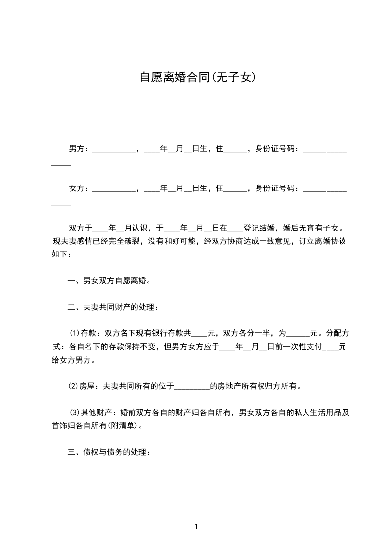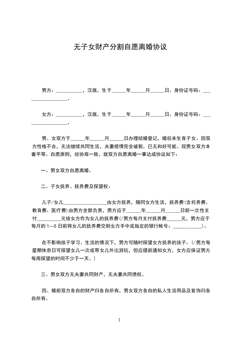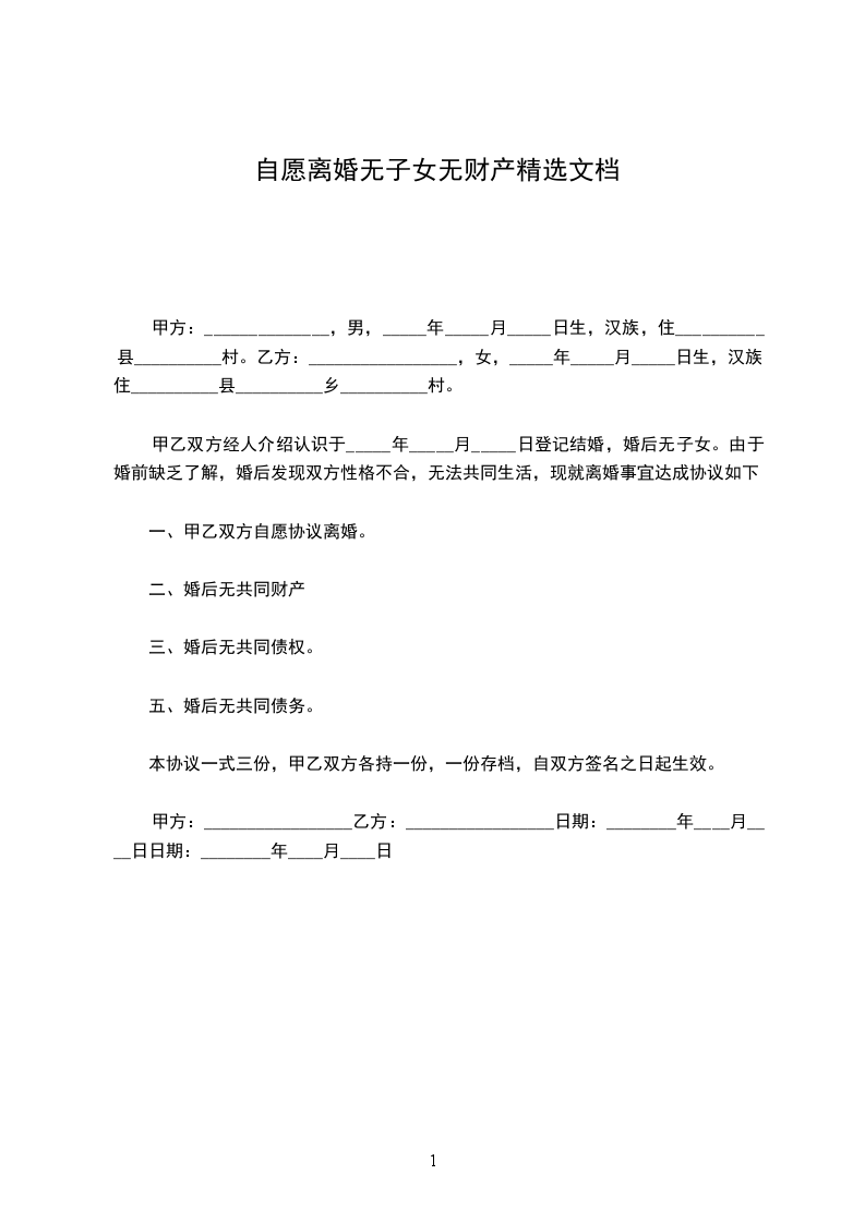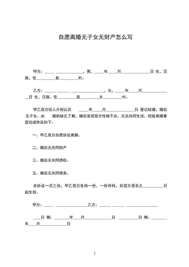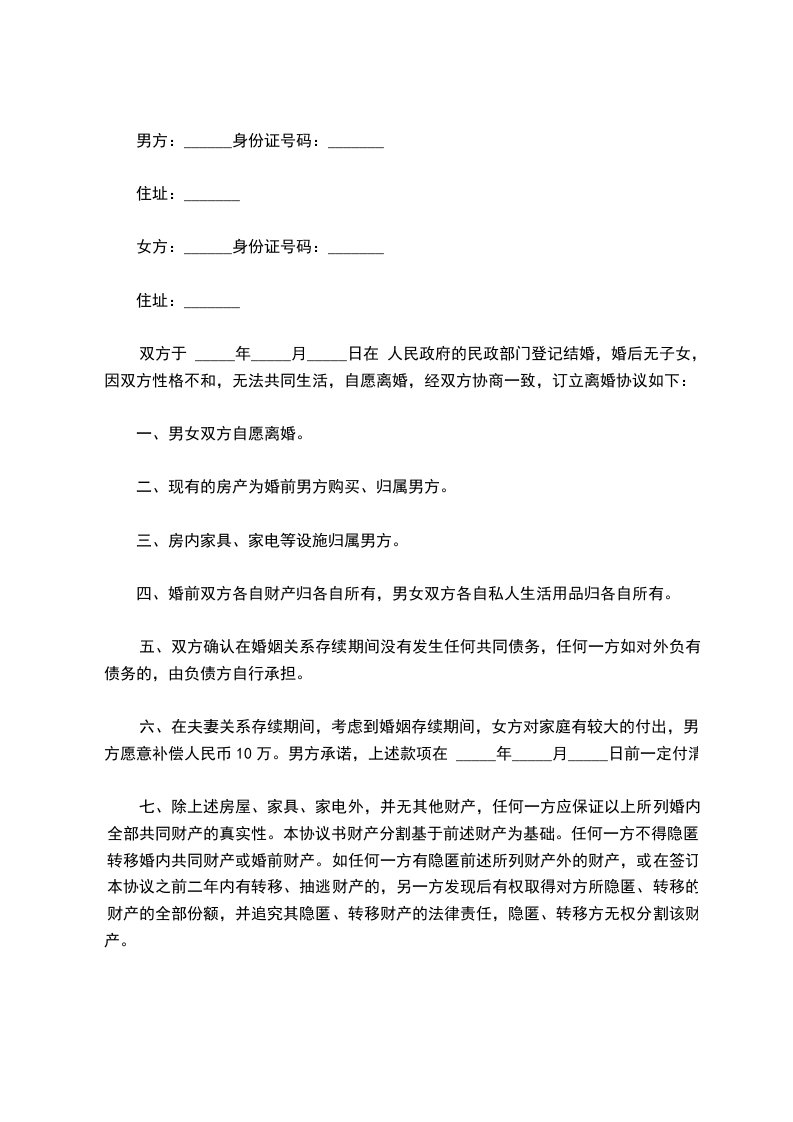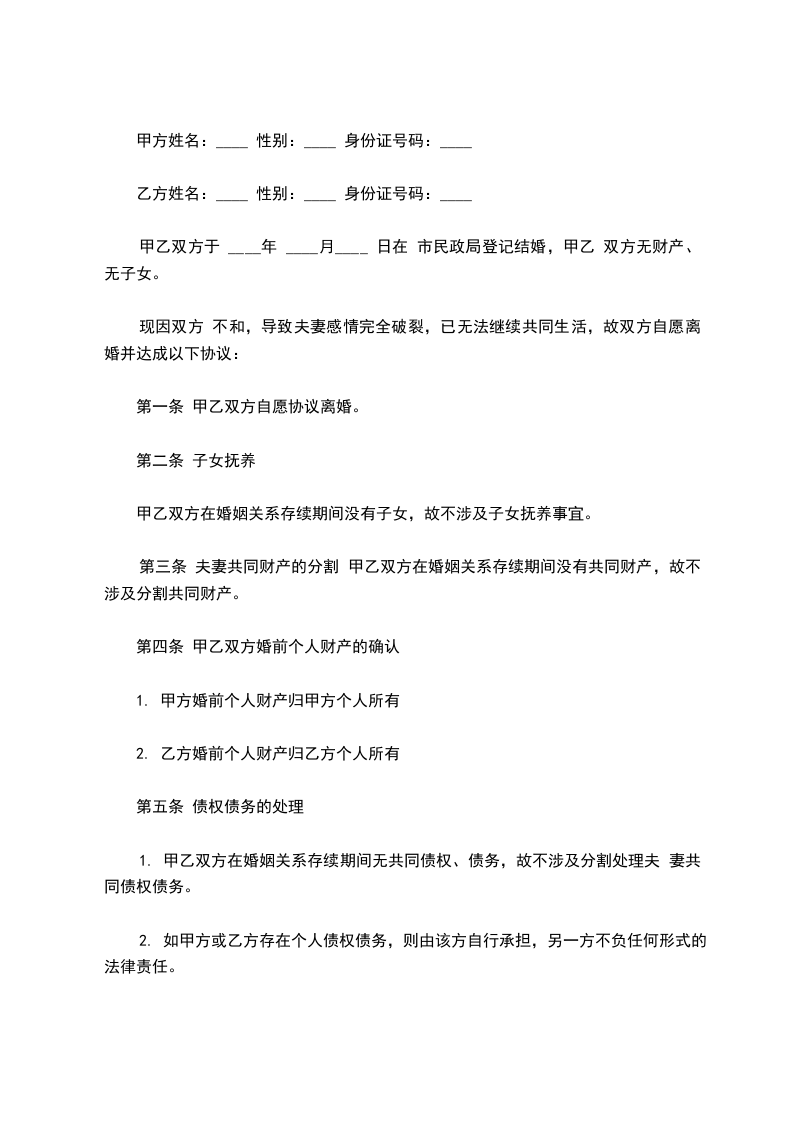甲乙双方经人介绍认识于________年________月________日登记结婚,婚后无子女。由于婚前缺乏了解,婚后发现双方性格不合,无法共同生活,现就离婚事宜达成协议如下: