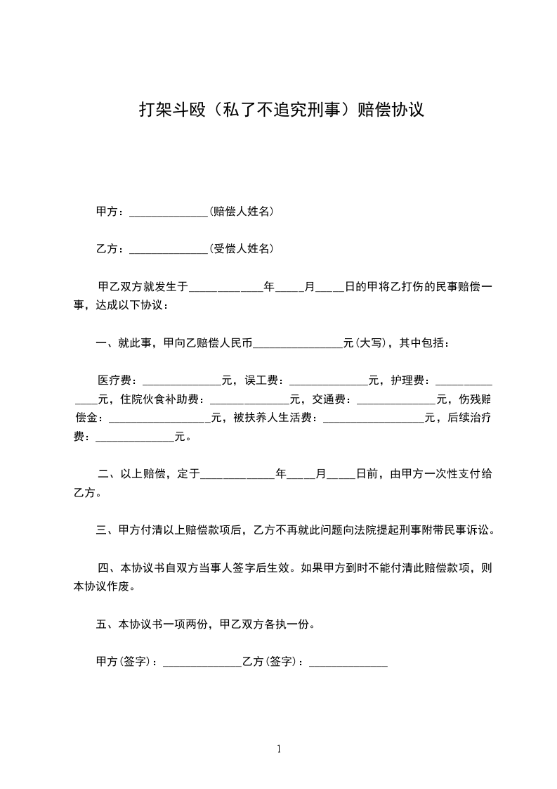 甲乙双方就发生于_____________年_____月_____日的甲将乙打伤的民事赔偿一事,达成以下协议: