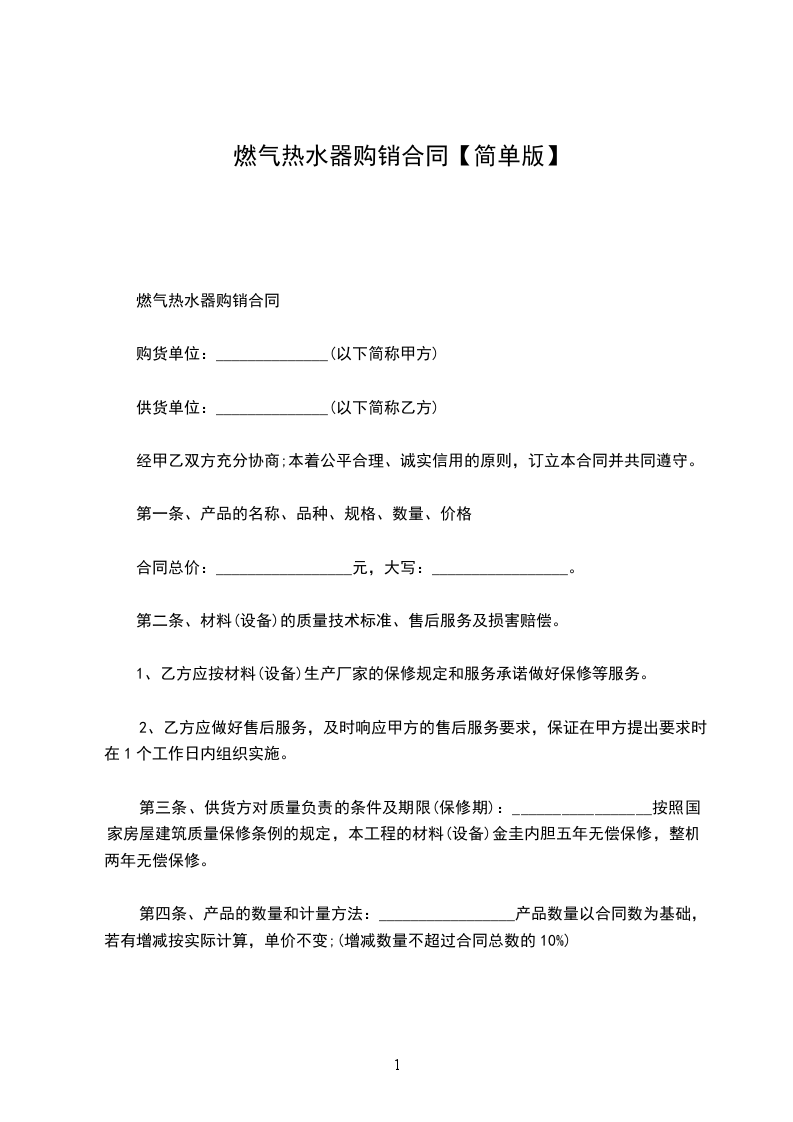 燃气热水器购销合同