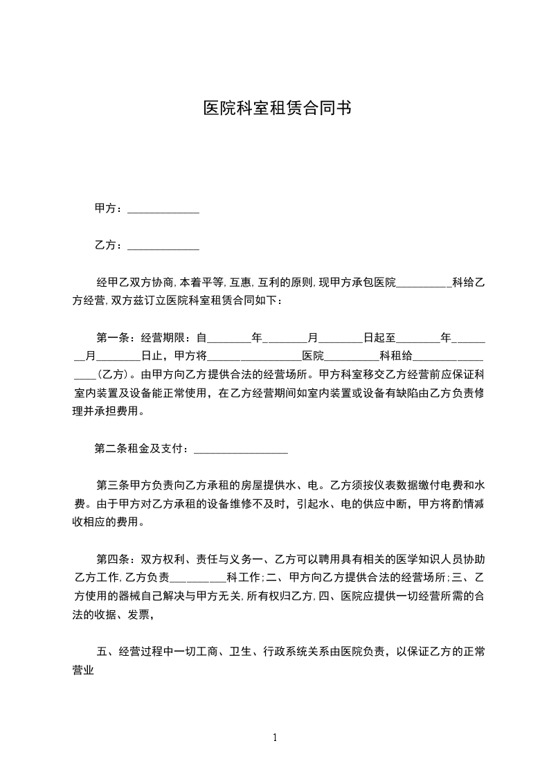 经甲乙双方协商,本着平等,互惠,互利的原则,现甲方承包医院__________科给乙方经营,双方兹订立医院科室租赁合同如下: