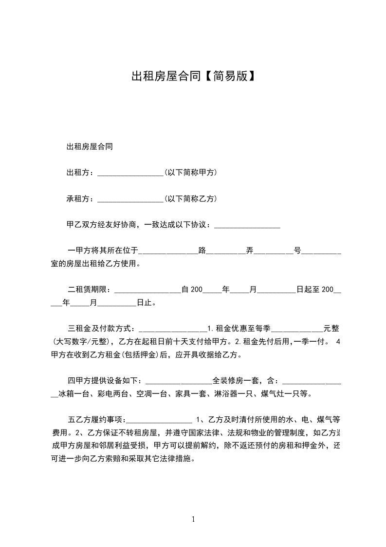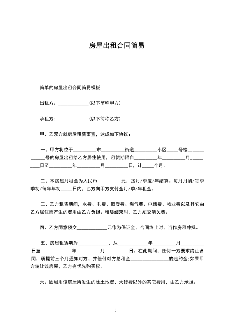 简单的房屋出租合同简易模板