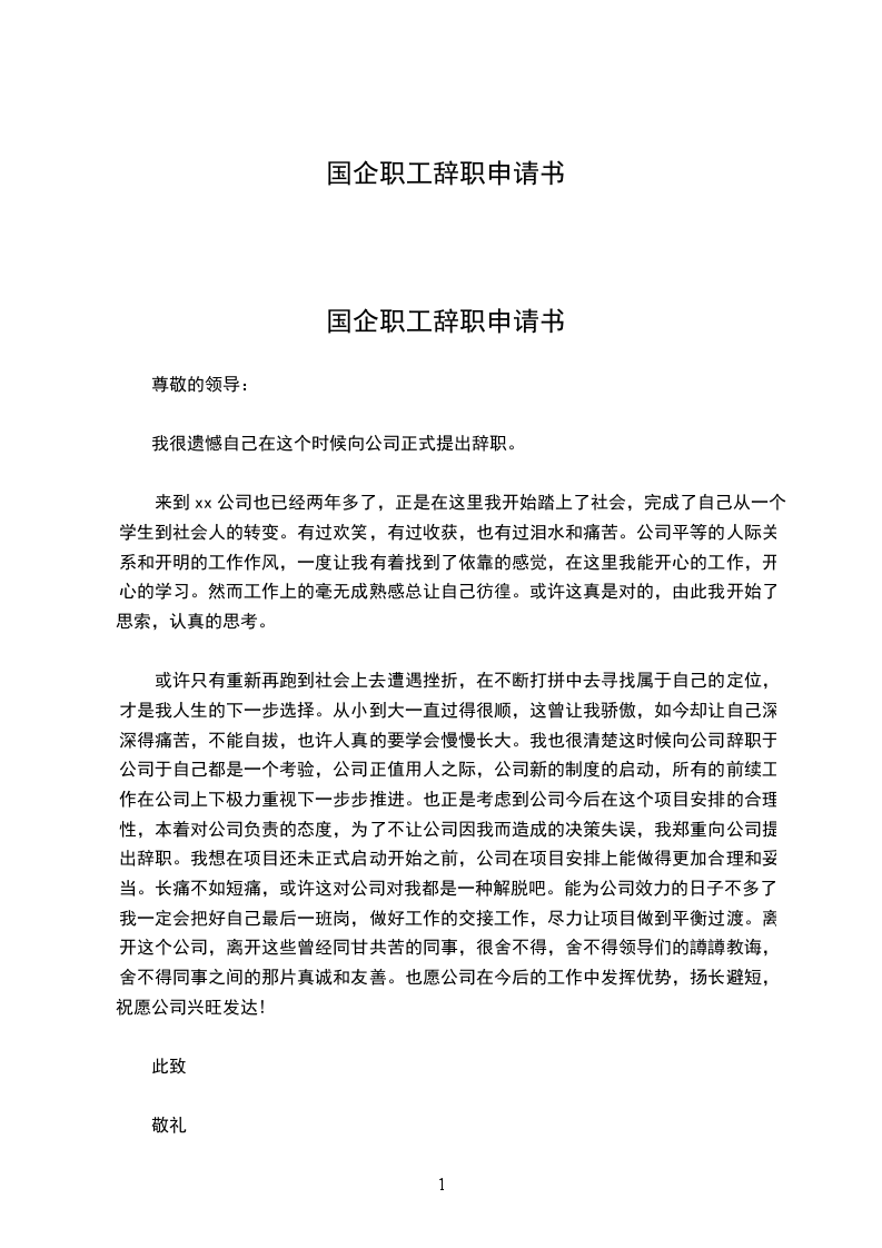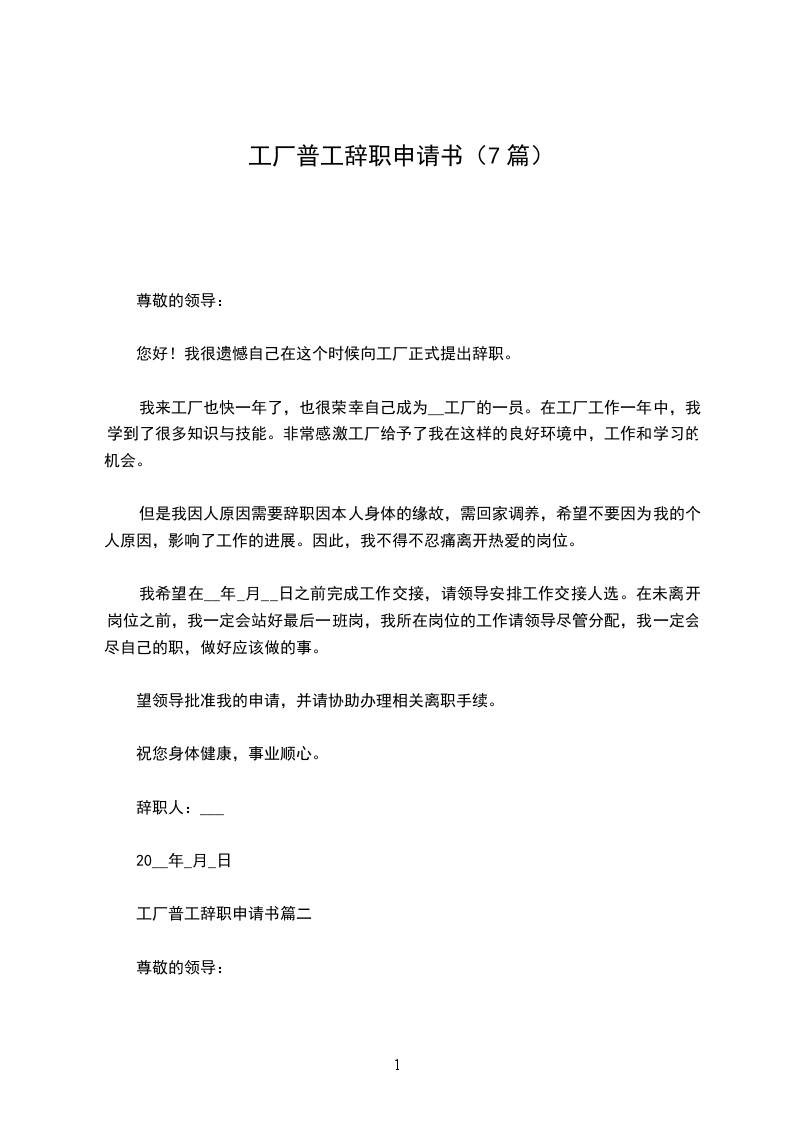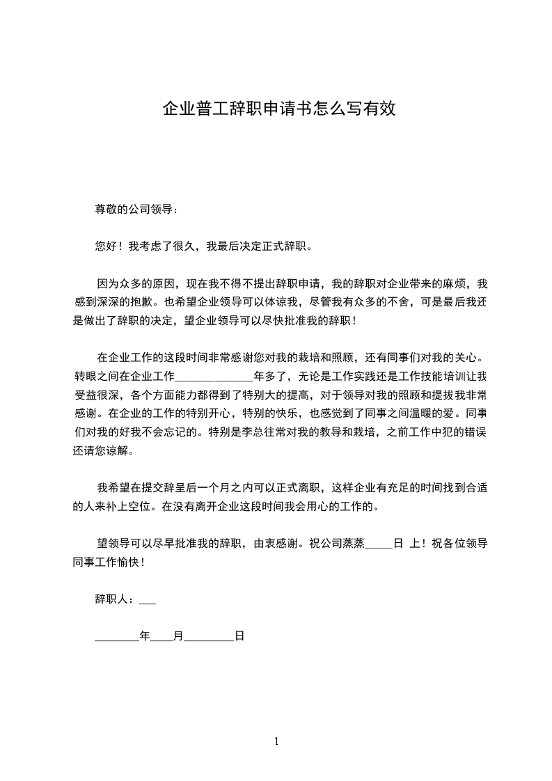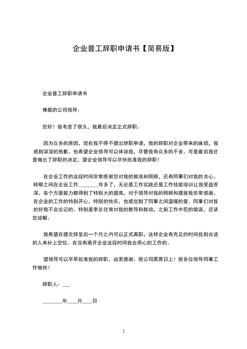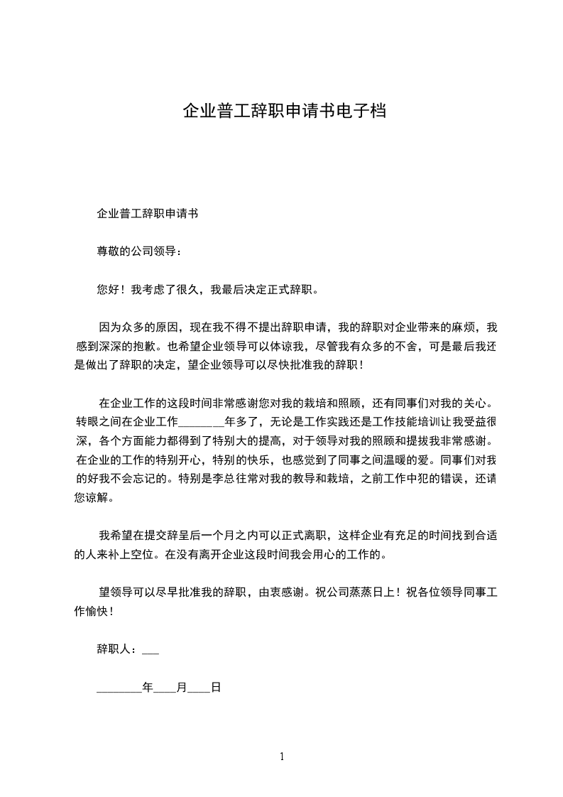 企业普工辞职申请书