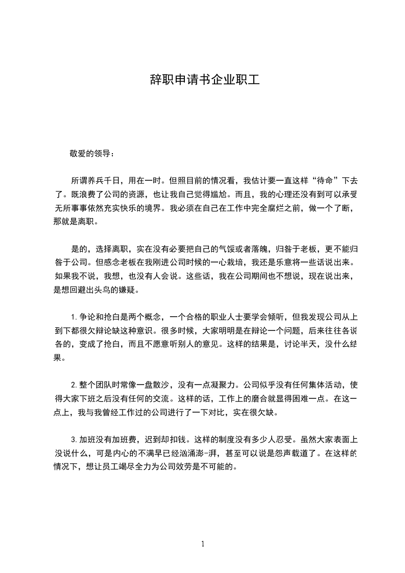 因为众多的原因,现在我不得不提出辞职申请,我的辞职对企业带来的麻烦,我感到深深的抱歉。也希望企业领导可以体谅我,尽管我有众多的不舍,可是最后我还是做出了辞职的决定,望企业领导可以尽快批准我的辞职!