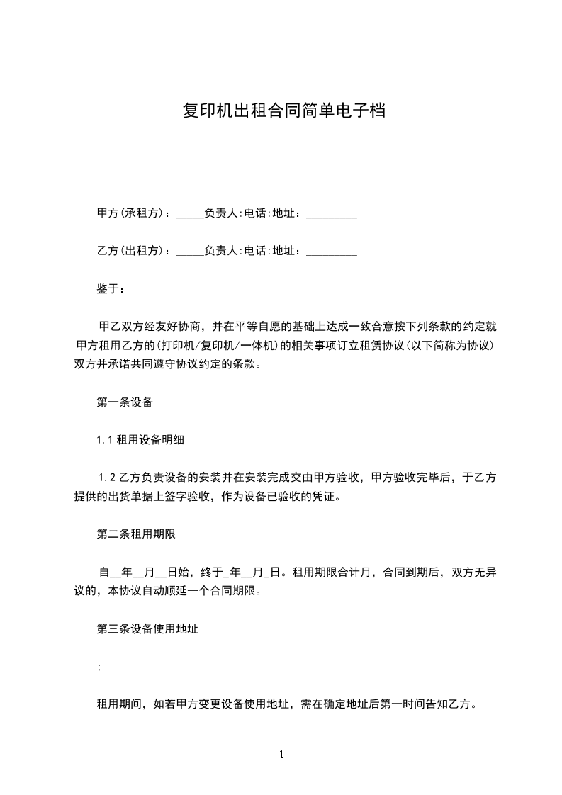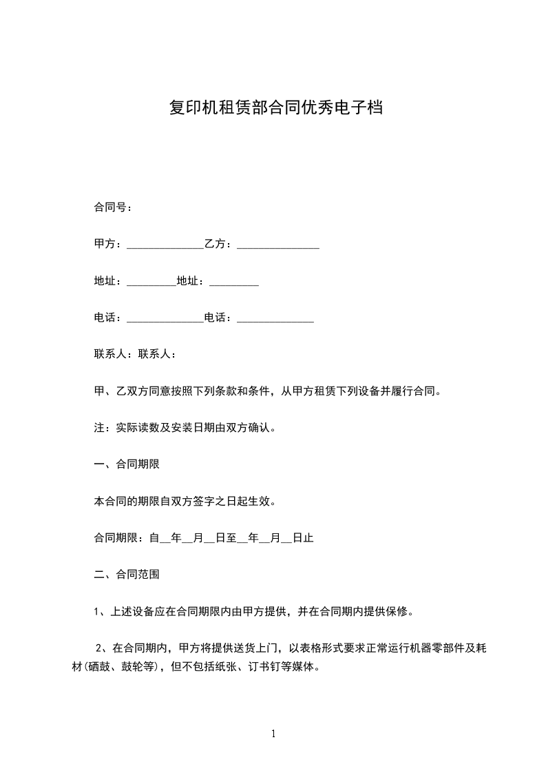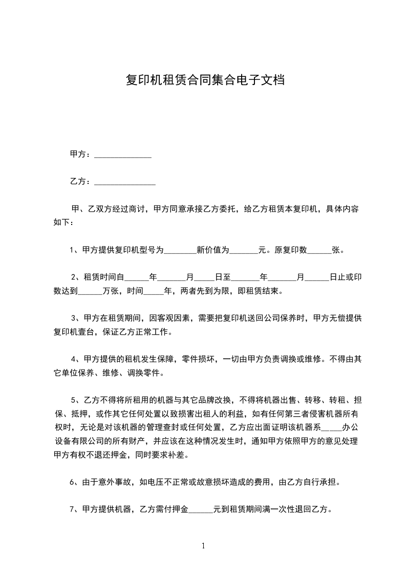 1.甲方提供复印机型号为________新价值为_______元。原复印数______张。