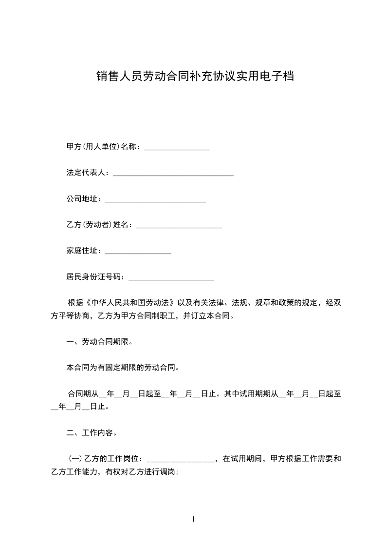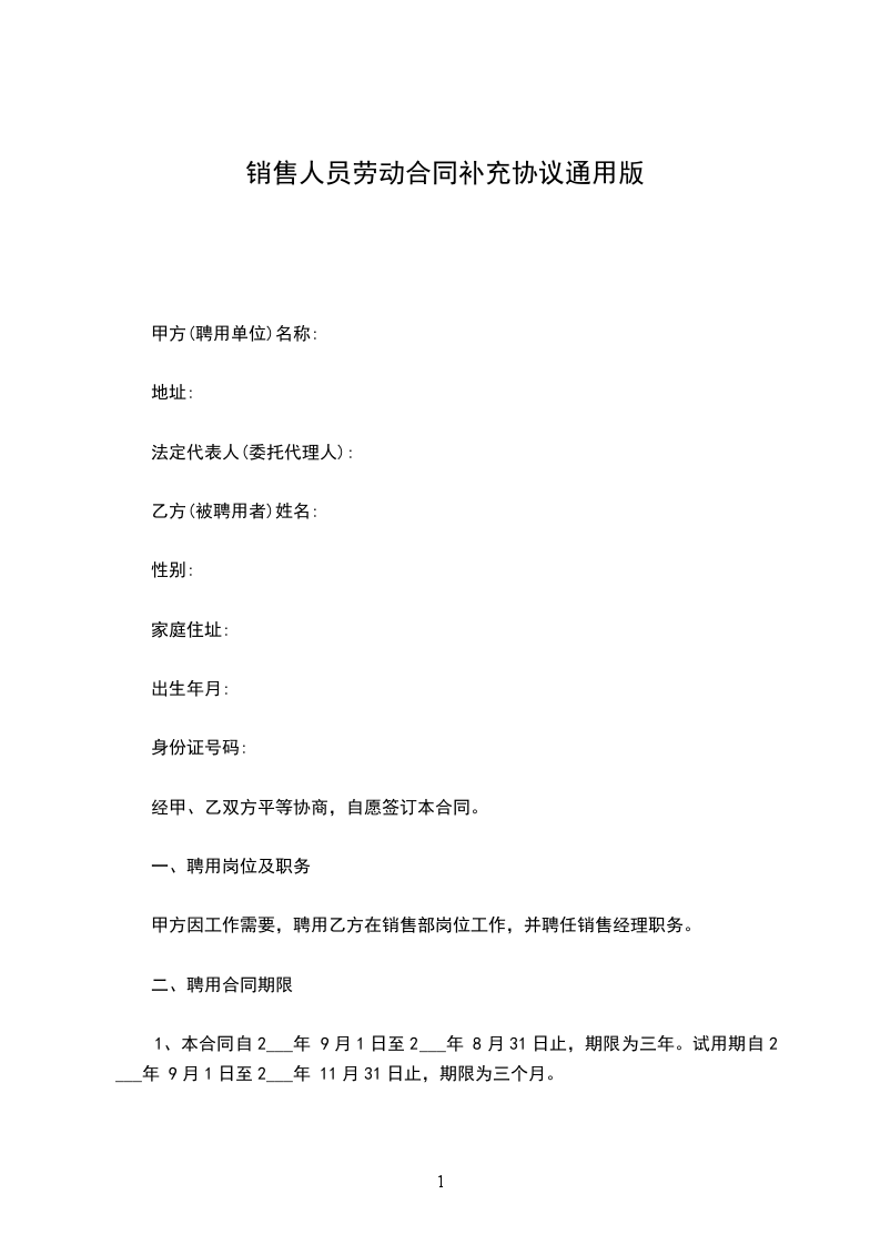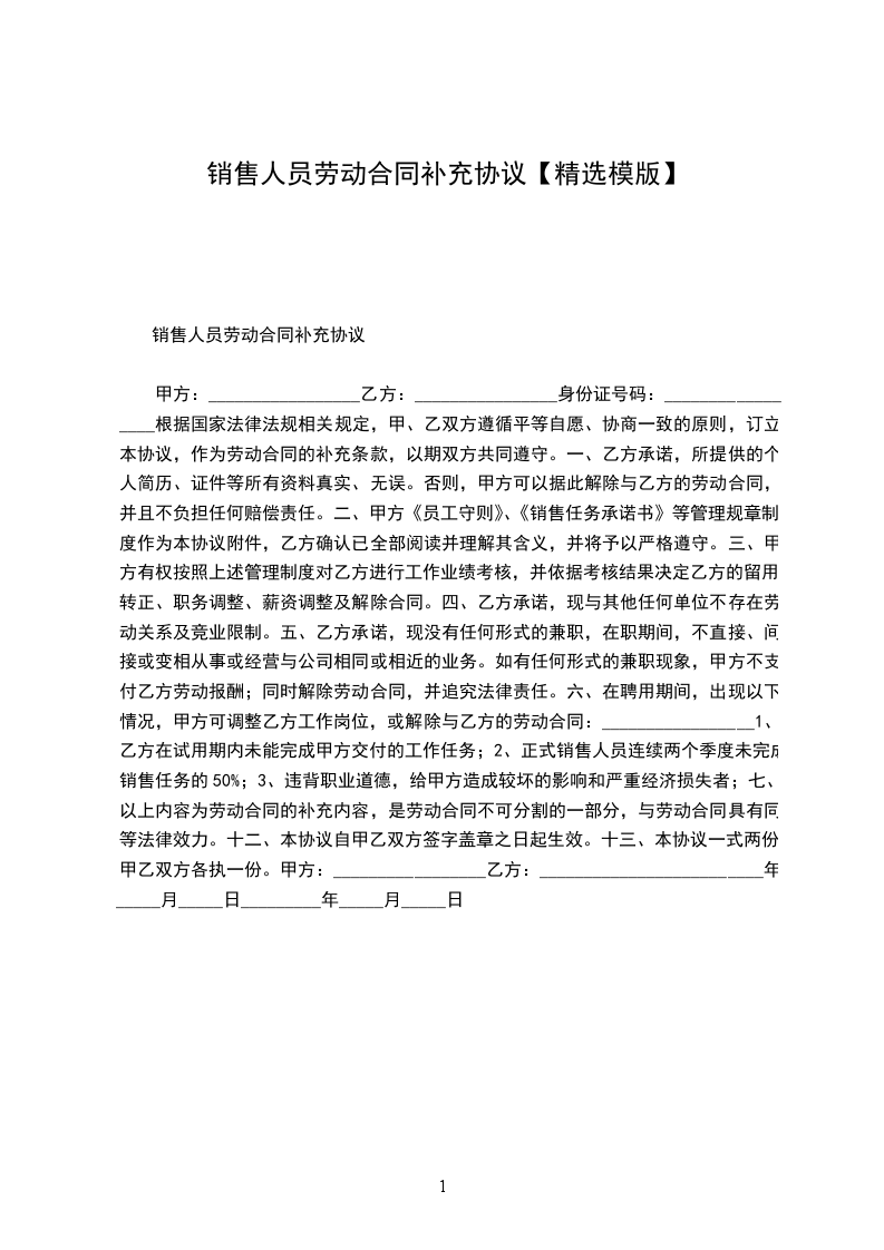 甲方:_________________乙方:________________身份证号码:_________________根据国家法律法规相关规定,甲、乙双方遵循平等自愿、协商一致的原则,订立本协议,作为劳动合同的补充条款,以期双方共同遵守。一、乙方承诺,所提供的个人简历、证件等所有资料真实、无误。否则,甲方可以据此解除与乙方的劳动合同,并且不负担任何赔偿责任。二、甲方《员工守则》、《销售任务承诺书》等管理规章制度作为本协议附件,乙方确认已全部阅读并理解其含义,并将予以严格遵守。三、甲方有权按照上述管理制度对乙方进行工作业绩考核,并依据考核结果决定乙方的留用、转正、职务调整、薪资调整及解除合同。四、乙方承诺,现与其他任何单位不存在劳动关系及竞业限制。五、乙方承诺,现没有任何形式的兼职,在职期间,不直接、间接或变相从事或经营与公司相同或相近的业务。如有任何形式的兼职现象,甲方不支付乙方劳动报酬;同时解除劳动合同,并追究法律责任。六、在聘用期间,出现以下情况,甲方可调整乙方工作岗位,或解除与乙方的劳动合同:_________________1、乙方在试用期内未能完成甲方交付的工作任务;2、正式销售人员连续两个季度未完成销售任务的50%;3、违背职业道德,给甲方造成较坏的影响和严重经济损失者;七、以上内容为劳动合同的补充内容,是劳动合同不可分割的一部分,与劳动合同具有同等法律效力。十二、本协议自甲乙双方签字盖章之日起生效。十三、本协议一式两份,甲乙双方各执一份。甲方:_________________乙方:_________________________年_____月_____日_________年_____月_____日