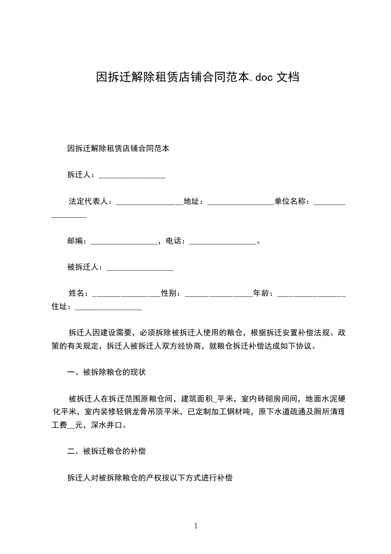 因拆迁解除租赁店铺合同范本