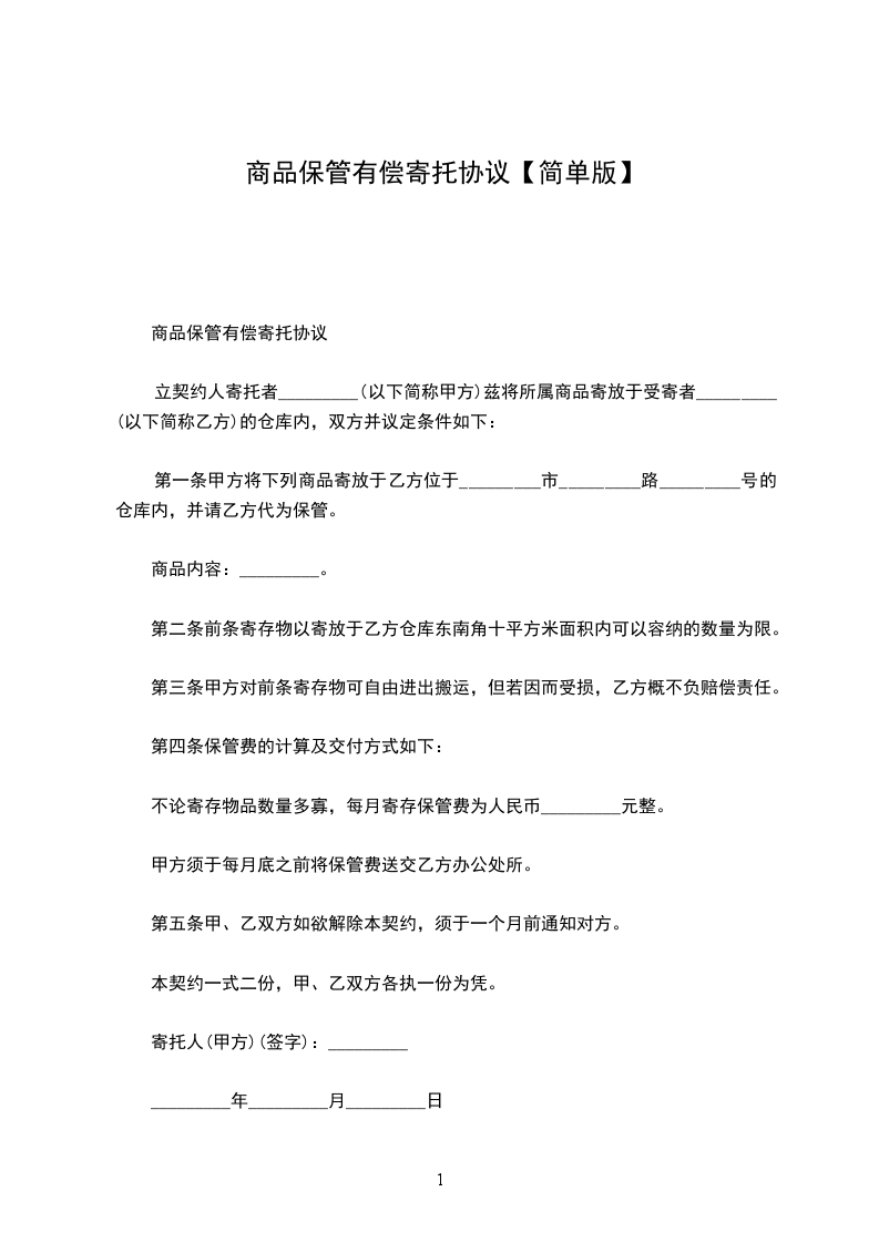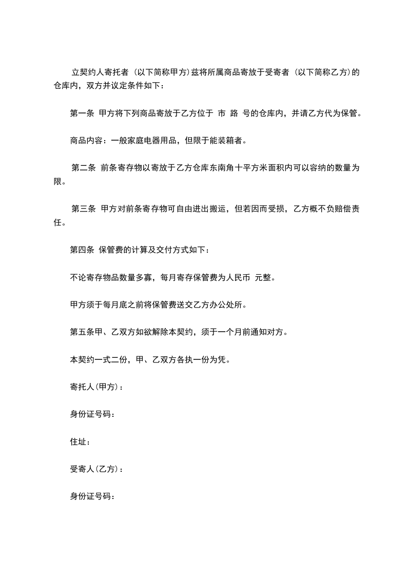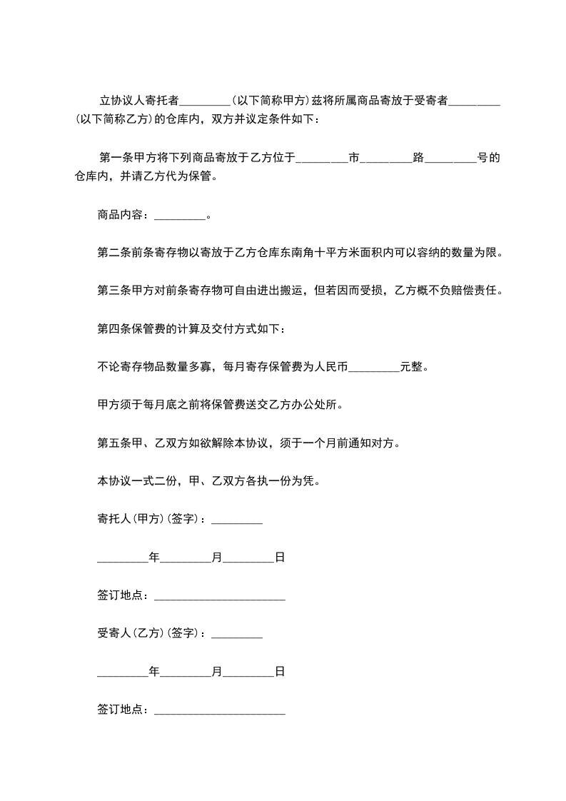 第一条甲方将下列商品寄放于乙方位于_________市_________路_________号的仓库内,并请乙方代为保管。