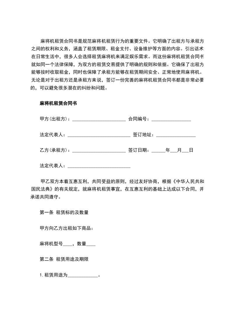 甲乙双方本着互惠互利,共同受益的原则,经过友好协商,根据《中华人民共和国民法典》的有关规定,就麻将机租赁事宜,在互惠互利的基础上达成以下合同,并承诺共同遵守。