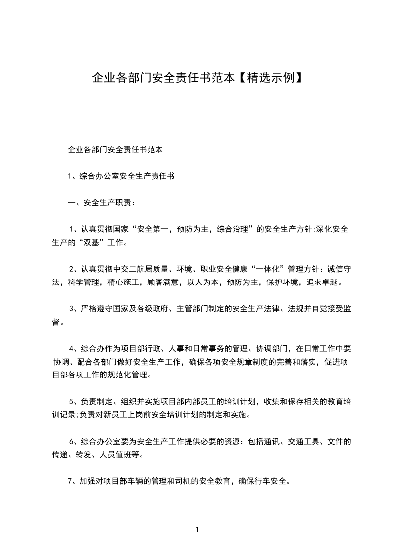 1、综合办公室安全生产责任书