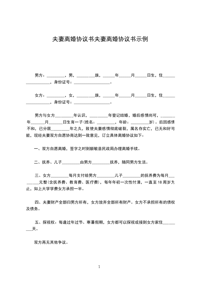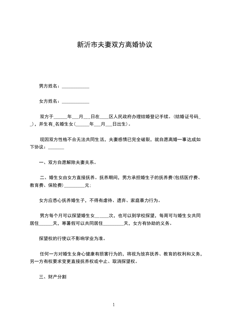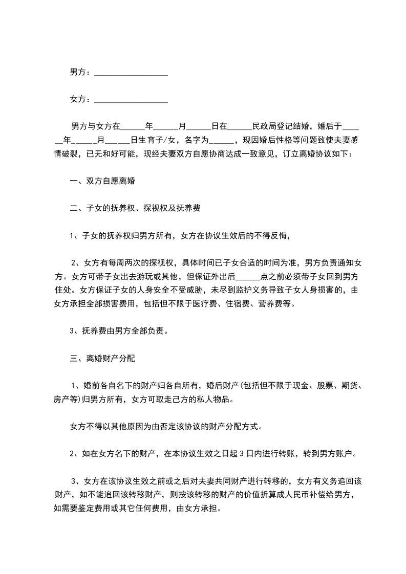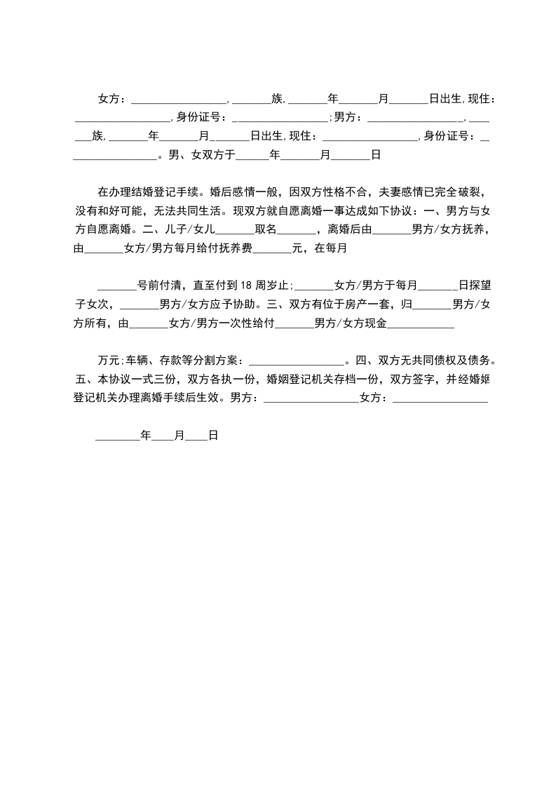 在办理结婚登记手续。婚后感情一般,因双方性格不合,夫妻感情已完全破裂,没有和好可能,无法共同生活。现双方就自愿离婚一事达成如下协议:一、男方与女方自愿离婚。二、儿子/女儿_______取名_______,离婚后由_______男方/女方抚养,由_______女方/男方每月给付抚养费_______元,在每月