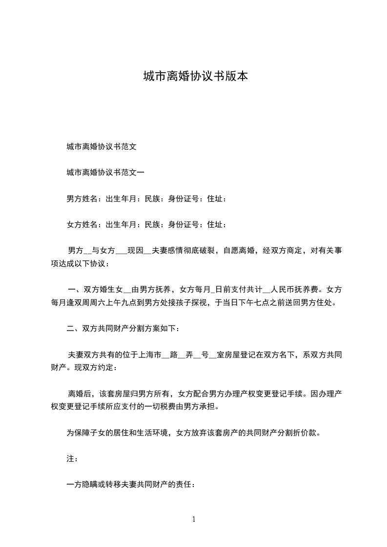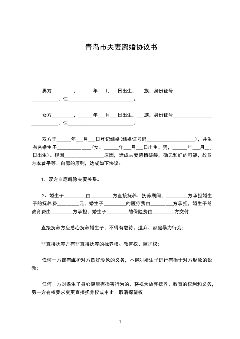 _______号前付清,直至付到18周岁止;_______女方/男方于每月_______日探望子女次,_______男方/女方应予协助。三、双方有位于房产一套,归_______男方/女方所有,由_______女方/男方一次性给付_______男方/女方现金____________