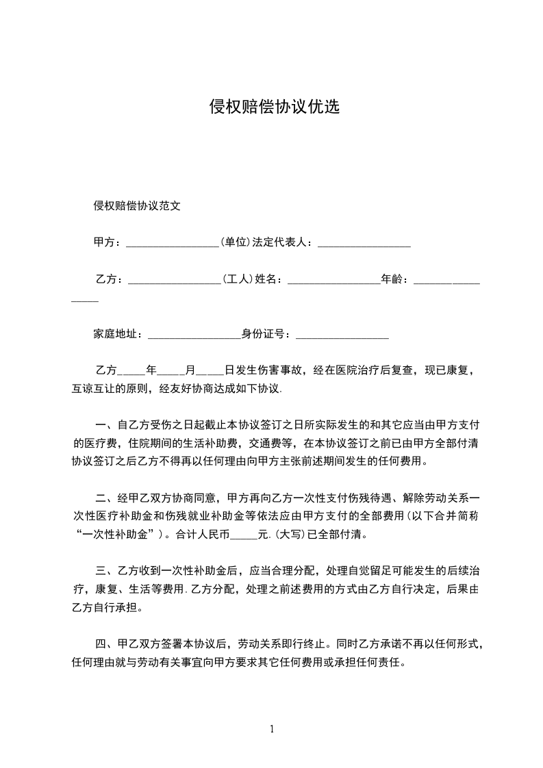 侵权赔偿协议范文