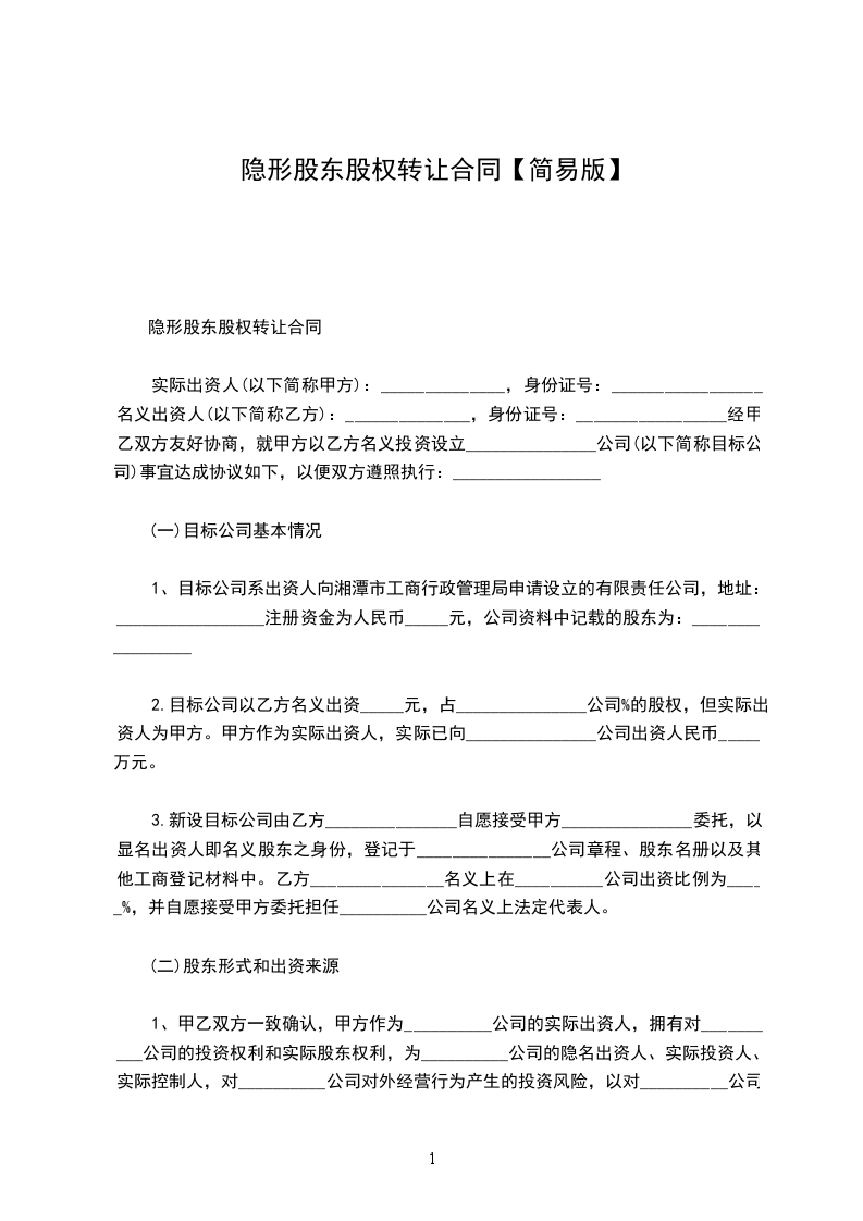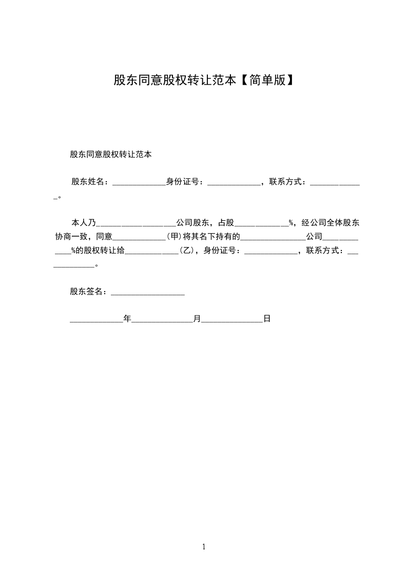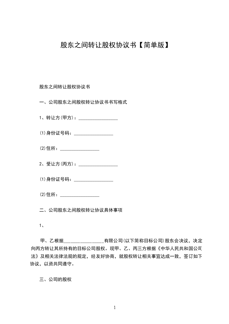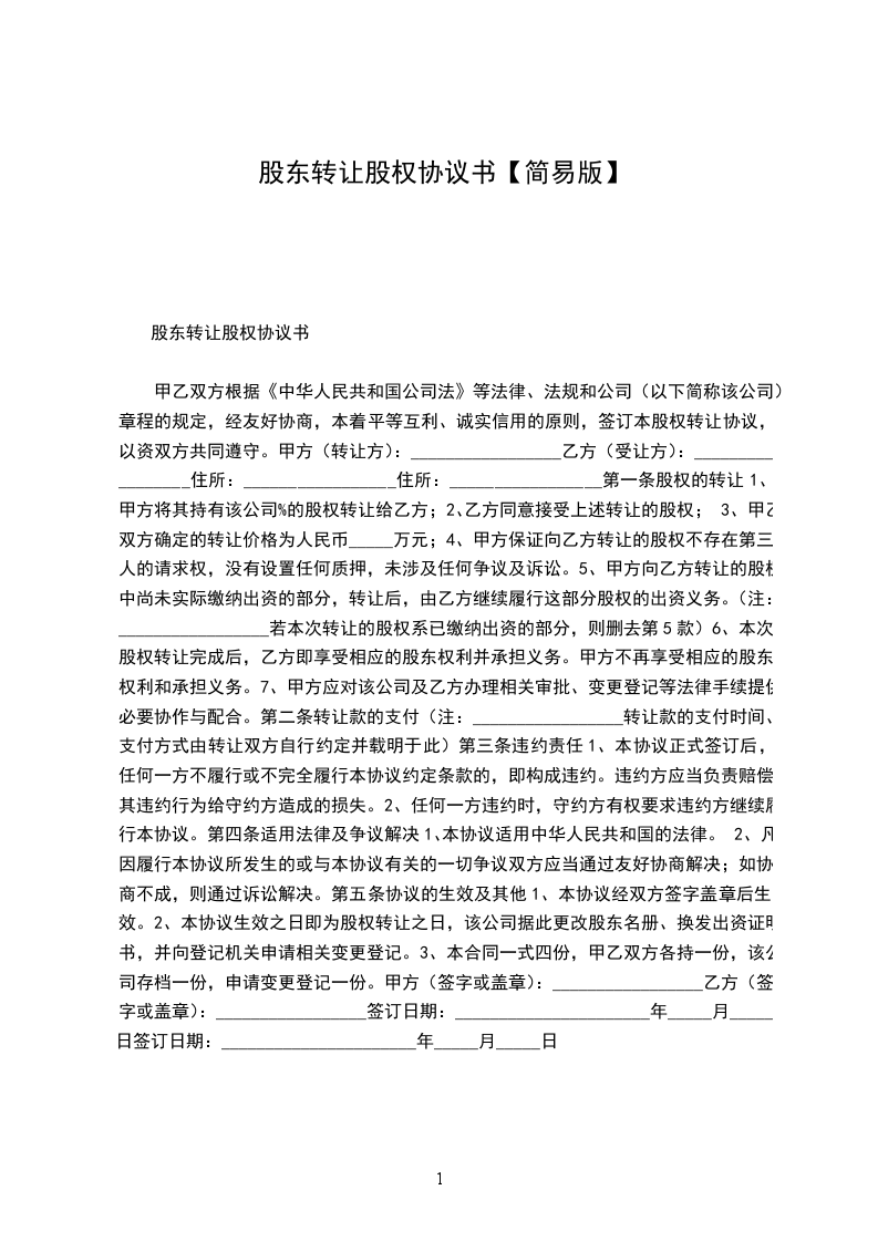 1、甲方同意将其在公司所持股权,即公司注册资本的%转让给乙方,乙方同意受让。