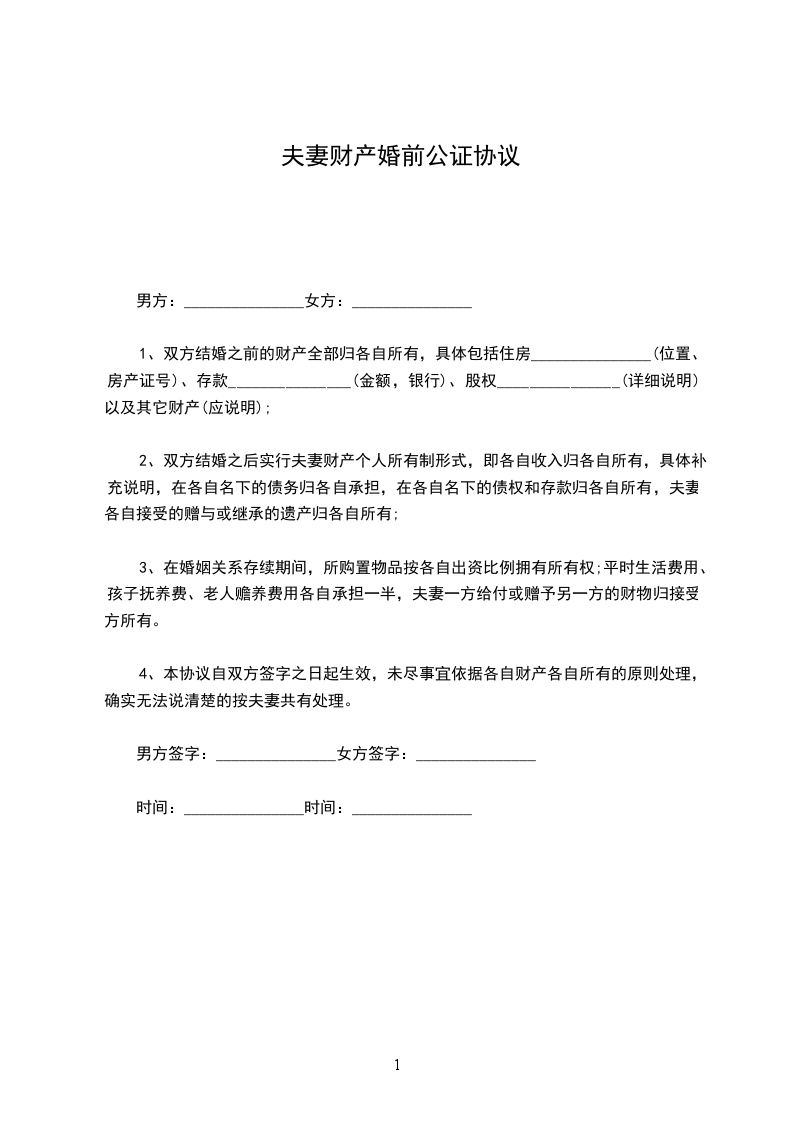 1、双方结婚之前的财产全部归各自所有,具体包括住房_______________(位置、房产证号)、存款_______________(金额,银行)、股权_______________(详细说明)以及其它财产(应说明);