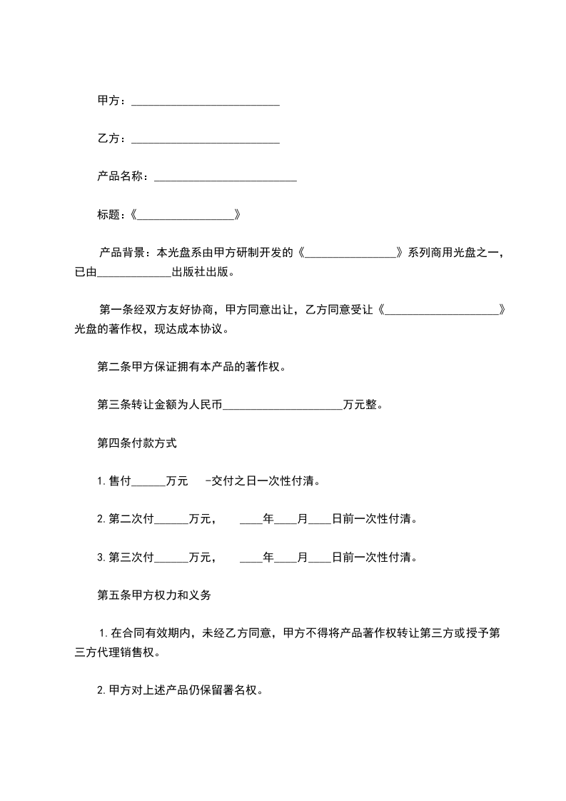 乙方为此向甲方支付软件著作权转让费用_____________元,以_____________形式支付,支付日期_____________年_____________月_____________日;